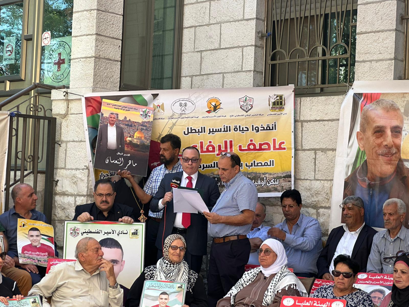 البيرة اليوم: من دعوة مؤسسات الأسـرى والقوى الوطنية والإسلامية، إسنادًا للأسير المصاب بالسرطان عاصف الرفاعي، وكافة رفاقه المرضى والمضربين عن الطعام، والأسرى في سجون الاحتلال، أمام الصليب الأحمر