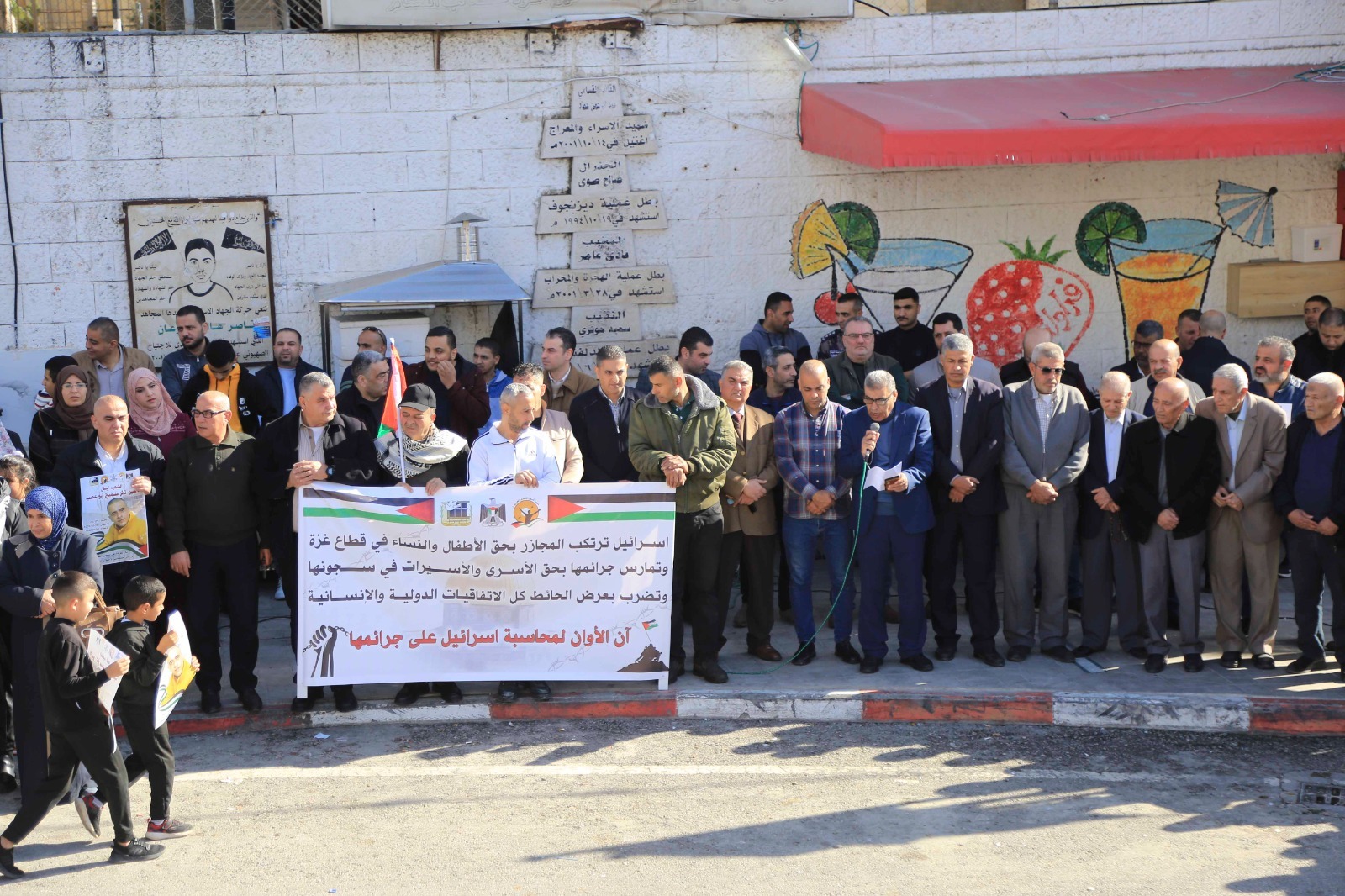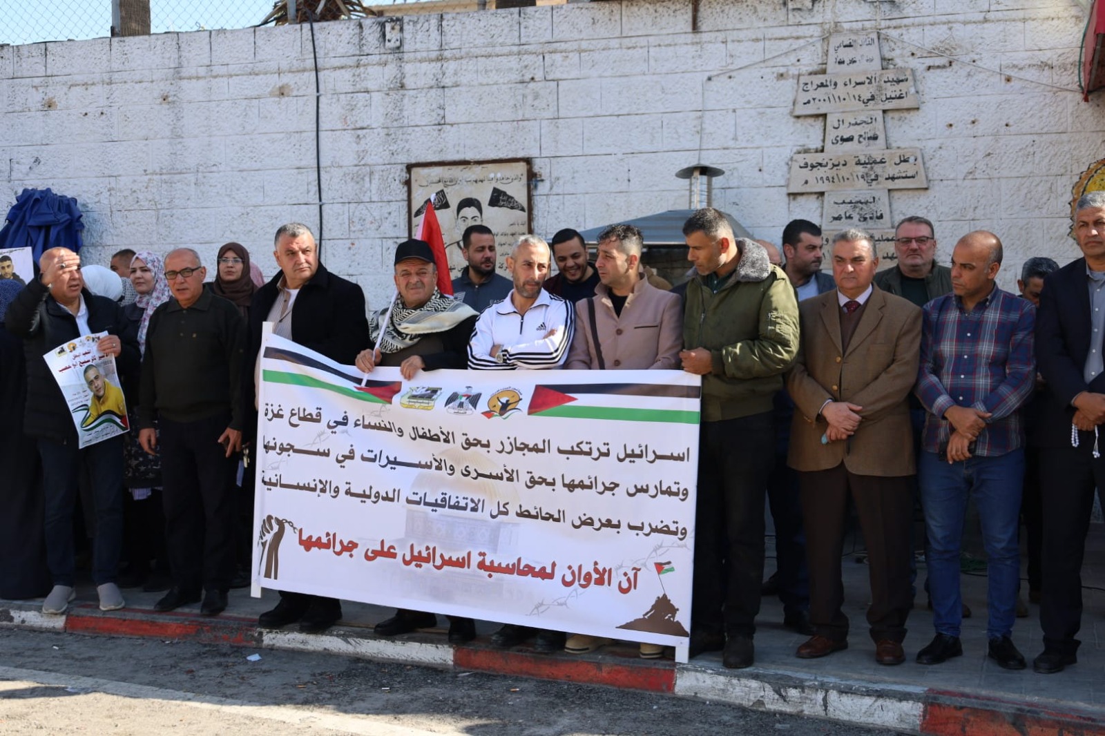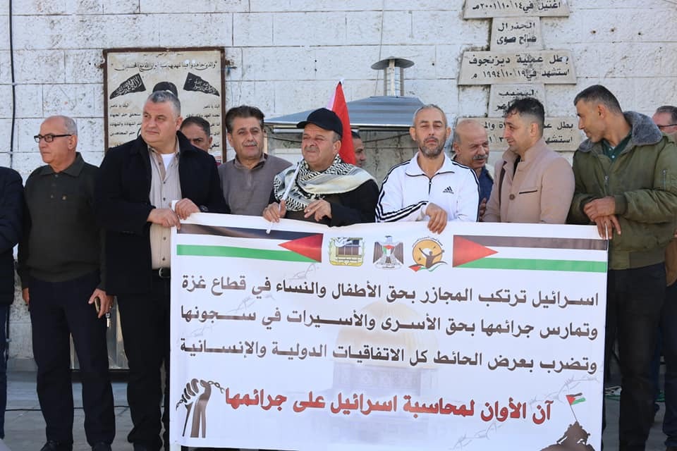 وخلال الوقفة ترحم مسير اعمال المحافظة على ارواح الشهداء الذين سقطوا دفاعا عن الحق الفلسطيني الراسخ، مؤكدا ان ما يحدث في قطاع غزة هو جريمة حرب يقوم بها جيش الارهاب الصهيوني وبدعم من الولايات المتحدة الامريكية وبتواطئ غربي، ووجه التحية الى الاسرى في سجون الاحتلال الذين يعيشون ظروف صعبة في ظل الاستهداف الممنهج من قبل بن جفير وعصابته بحق الاسرى، مشيرا الى جريمة قتل الاسير الشهيد ثائر ابو عصب الذي اغتيل في الاسر بدم بارد، مؤكدا ان هذه الجريمة النكراء والتي يندى لها جبين الانسانية ستبقى ماثلة امام العالم الذي ينادي بالحرية وبحقوق الانسان والذي بقي صامتا حيال ما يجري من جرائم بحق الشعب الفلسطيني الاعزل.