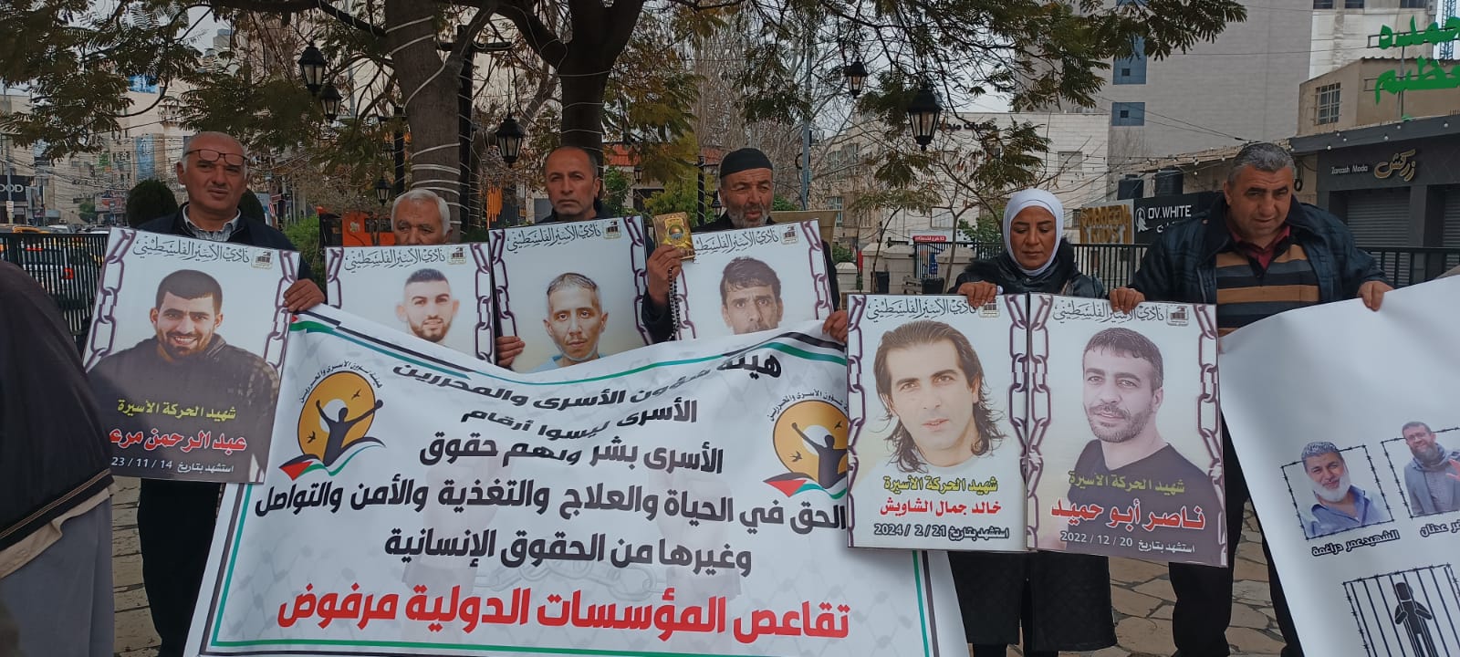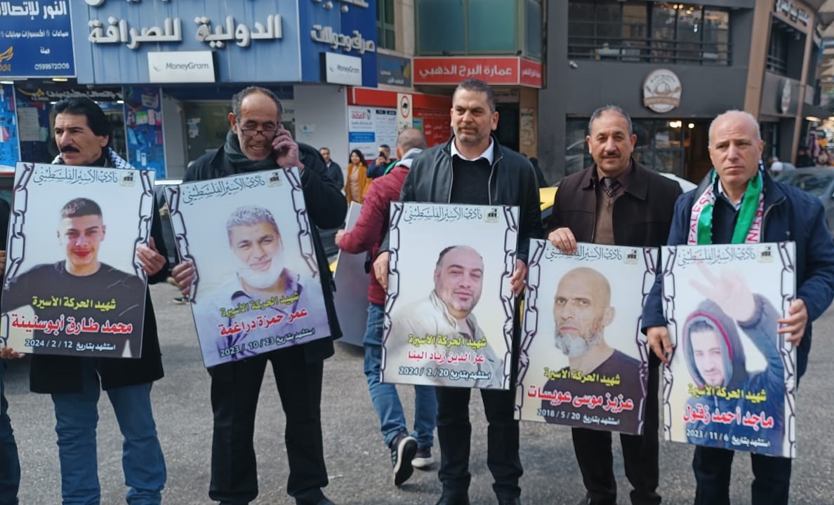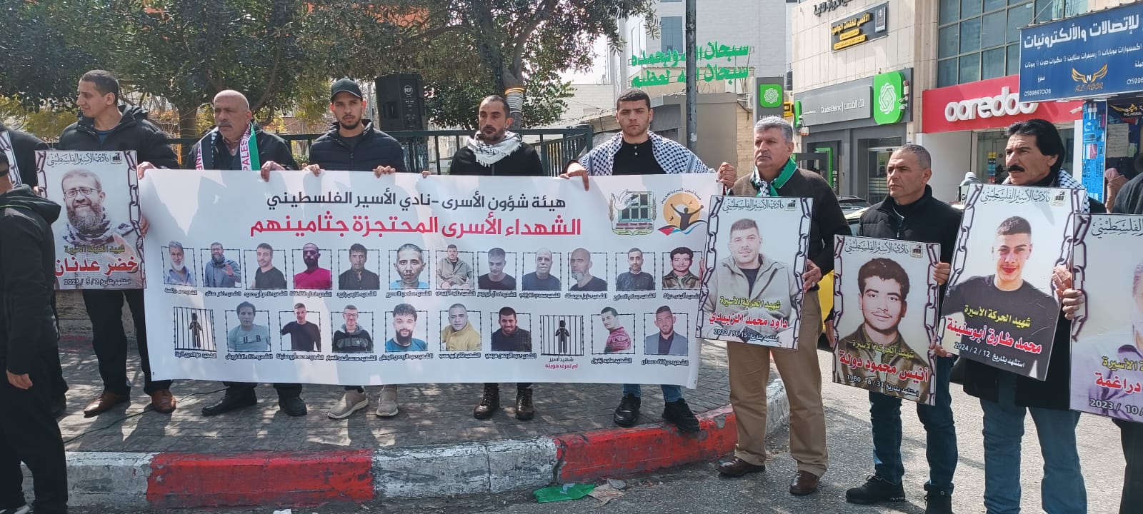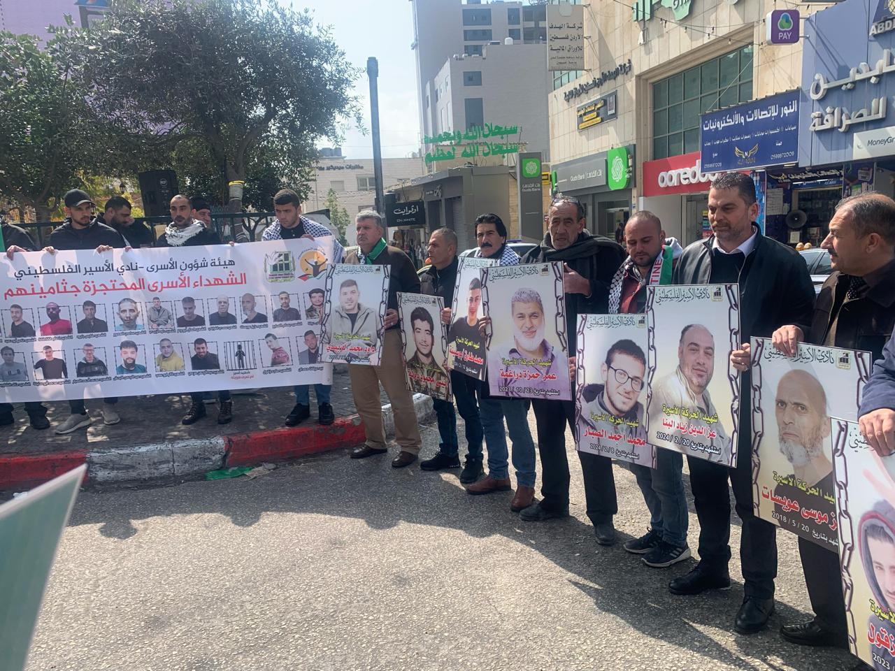 ورفع المشاركون في الوقفة صور الاسرى الشهداء الاسرى المحتجزة جثامينهم في ثلاجات الاحتلال والذين ارتقوا شهداء خاصة بعد السابع من كتوبر والتي تخللها عمليات قمع وتنكيل وتطهير وابادة للأسرى والاسيرات في فترة زمنية قصيرة جدا خلال اربع شهور فقط ..