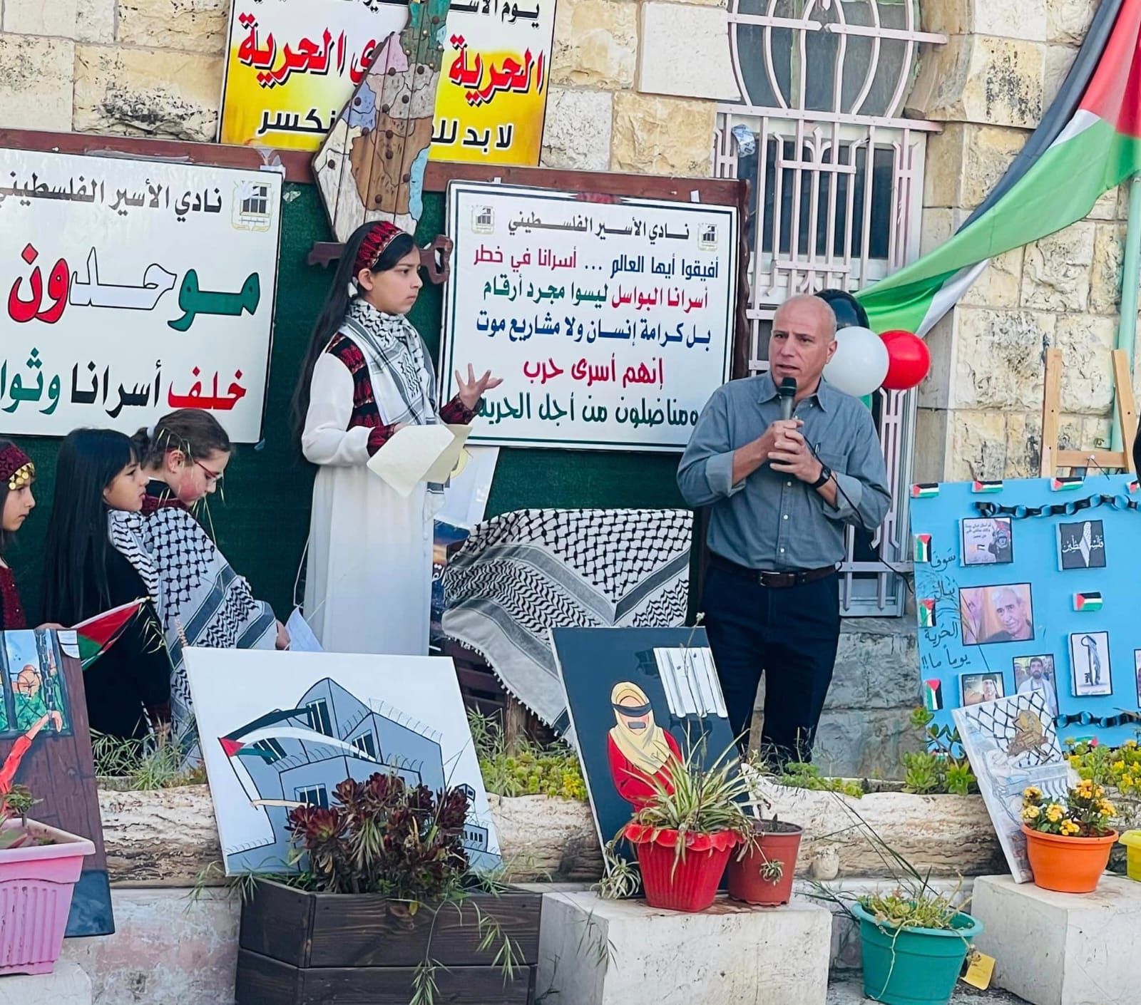 وفي كلمة امجد النجار الناطق الإعلامي باسم نادي الأسير الفلسطيني مقدما الشكر الكبير لوزارة التربية والتعليم الشريك الدائم في كافة فعاليات احياء يوم الأسير و ان هذا النشاط للمدرسة يأتي في سياق مشاركة وزارة التربية والتعليم في كل الانشطة الداعمة للاسرى وحريتهم، معتبرا ان تواصل الفعاليات و التفاعل الشعبي ومن مختلف الاجيال مع قضية الاسرى هي استفتاء جماهيري وموقف فلسطيني بامتياز يؤكد على قدسية واهمية قضية الاسرى والدفاع عن حقوقهم ودعمهم في كل المجالات.
