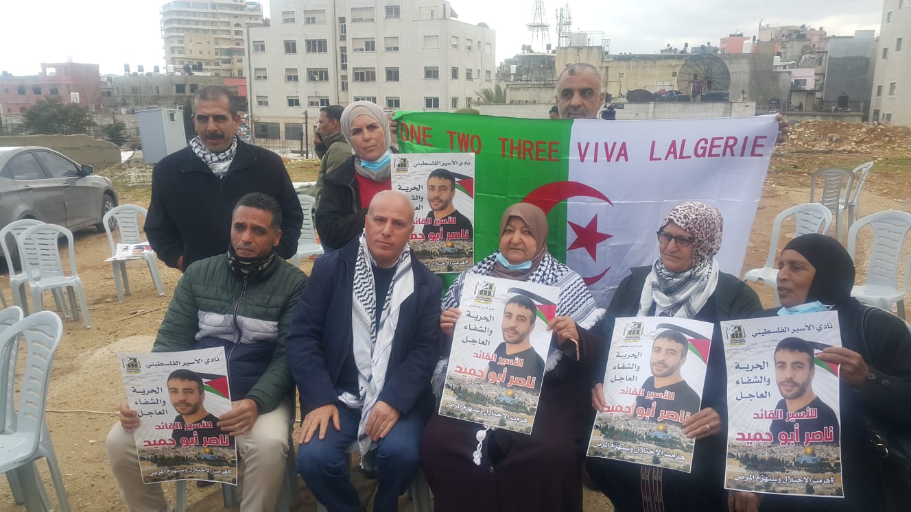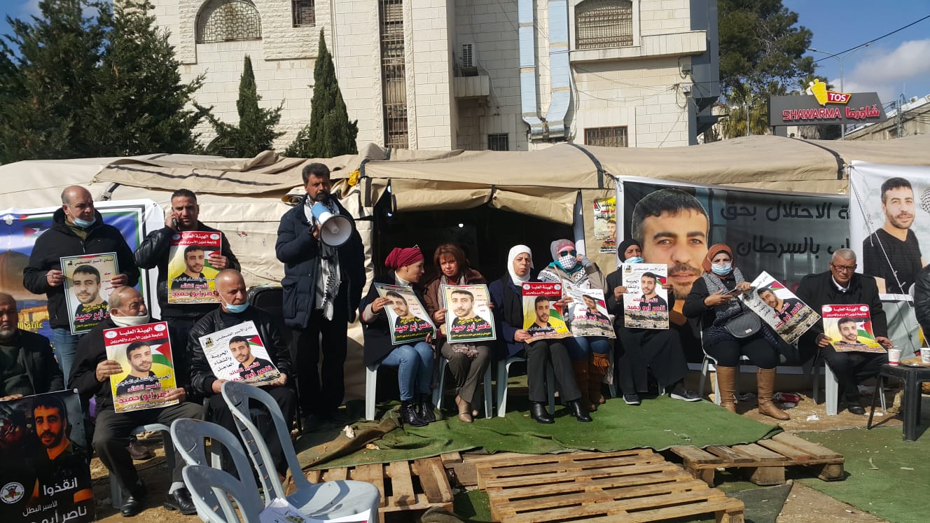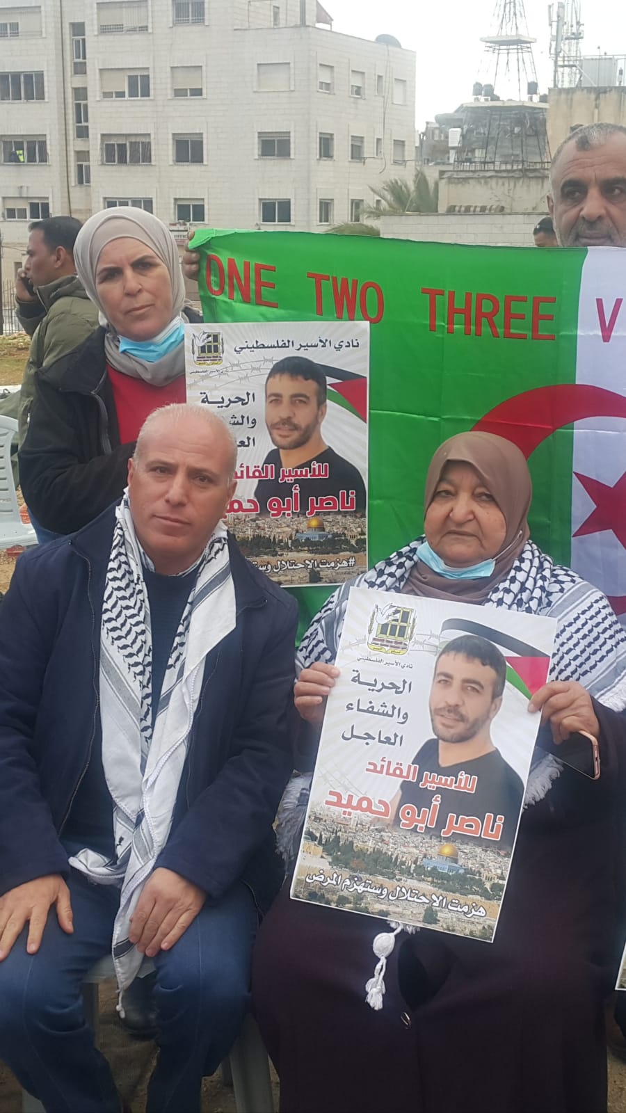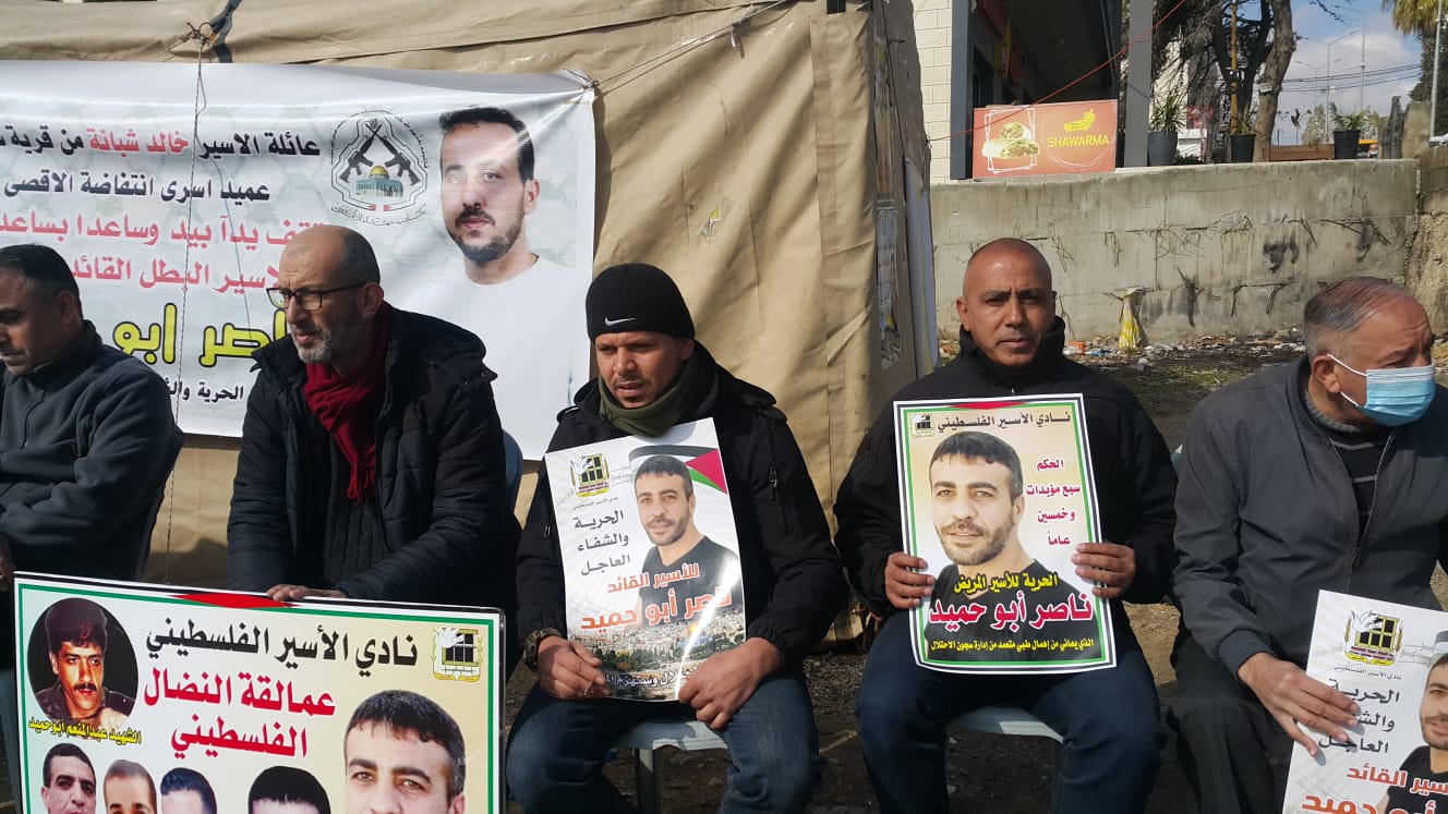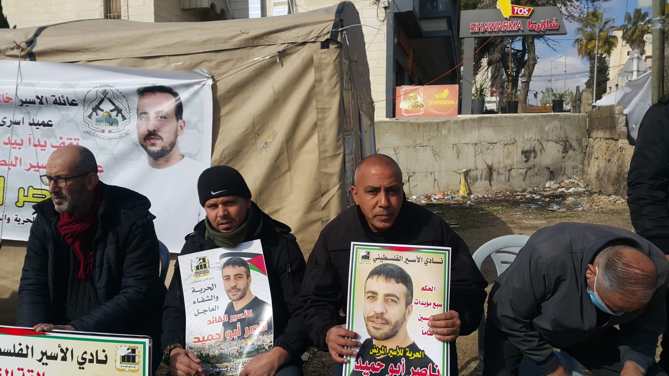صور | من فعاليات الوقفة التضامنية لدعم ومساندة الأسير ناصر أبو حميد أمام خيمة الاعتصام في مخيم الأمعري رام الله.