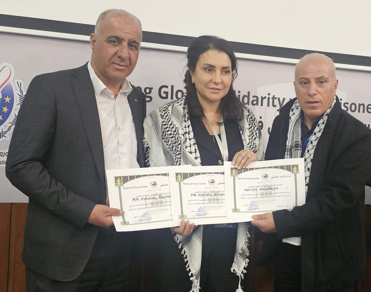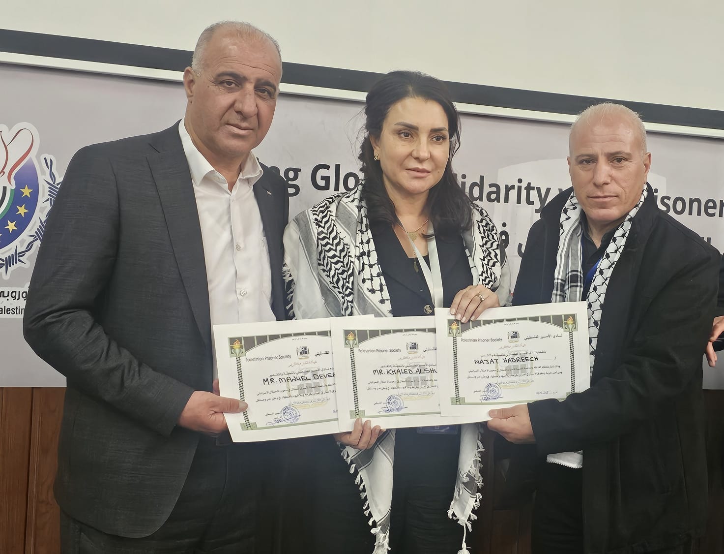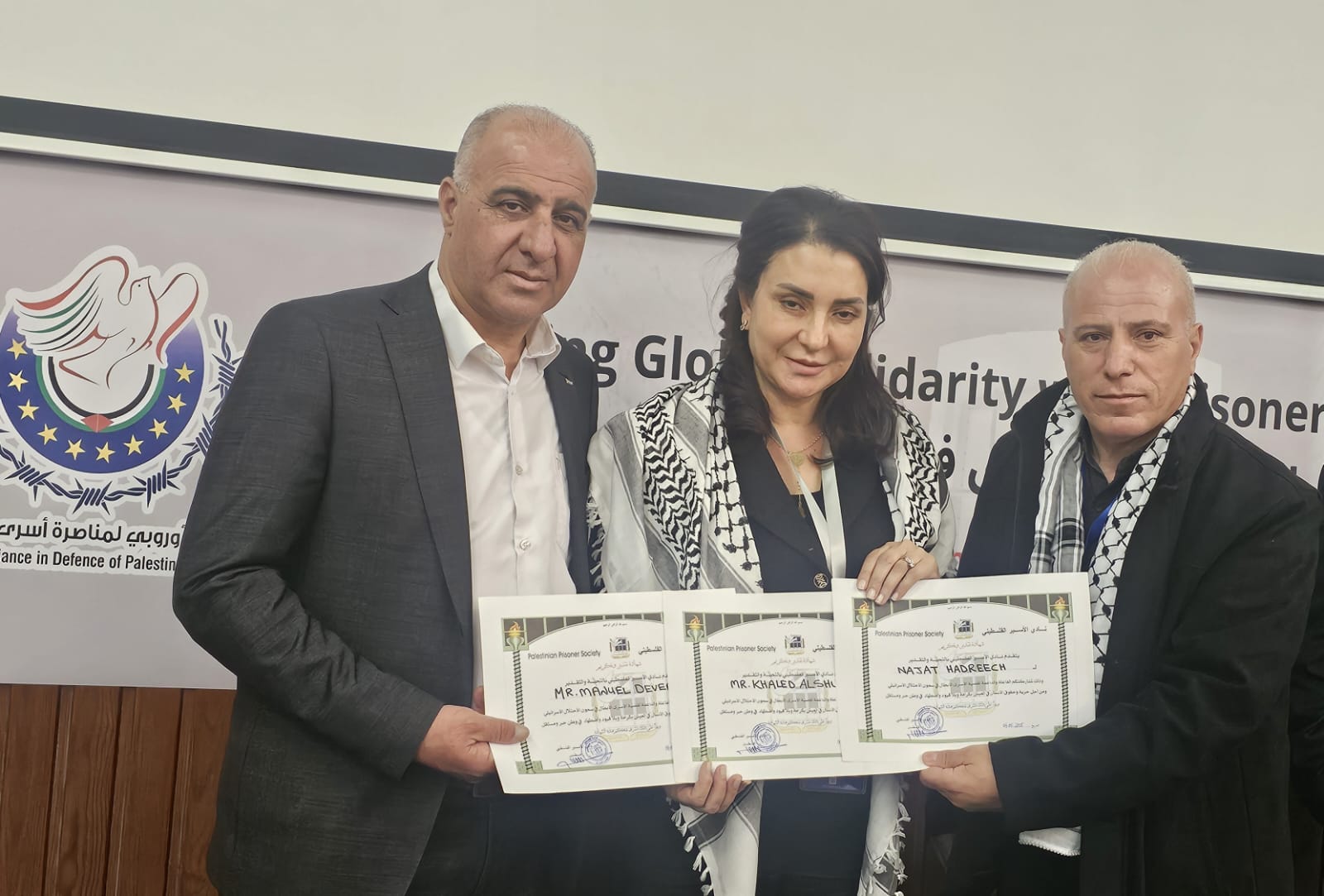 التقى وفد من نادي الأسير الفلسطيني والهيئة العليا لمتابعة شؤون الأسرى، على هامش فعاليات مؤتمر التحالف الأوروبي لمناصرة أسرى فلسطين، بفريق من المحامين الدوليين، ضم المحامي مانويل دوفيرز، نجل المحامي الفرنسي الراحل جيل دوفير والذي يكمل مشوار وحلم والده بوضع قادة الاحتلال خلف القضبان ، والمحامي خالد الشولي، والمحامية التونسية نجاة هدريش، المتخصصة في القانون الجنائي الدولي.