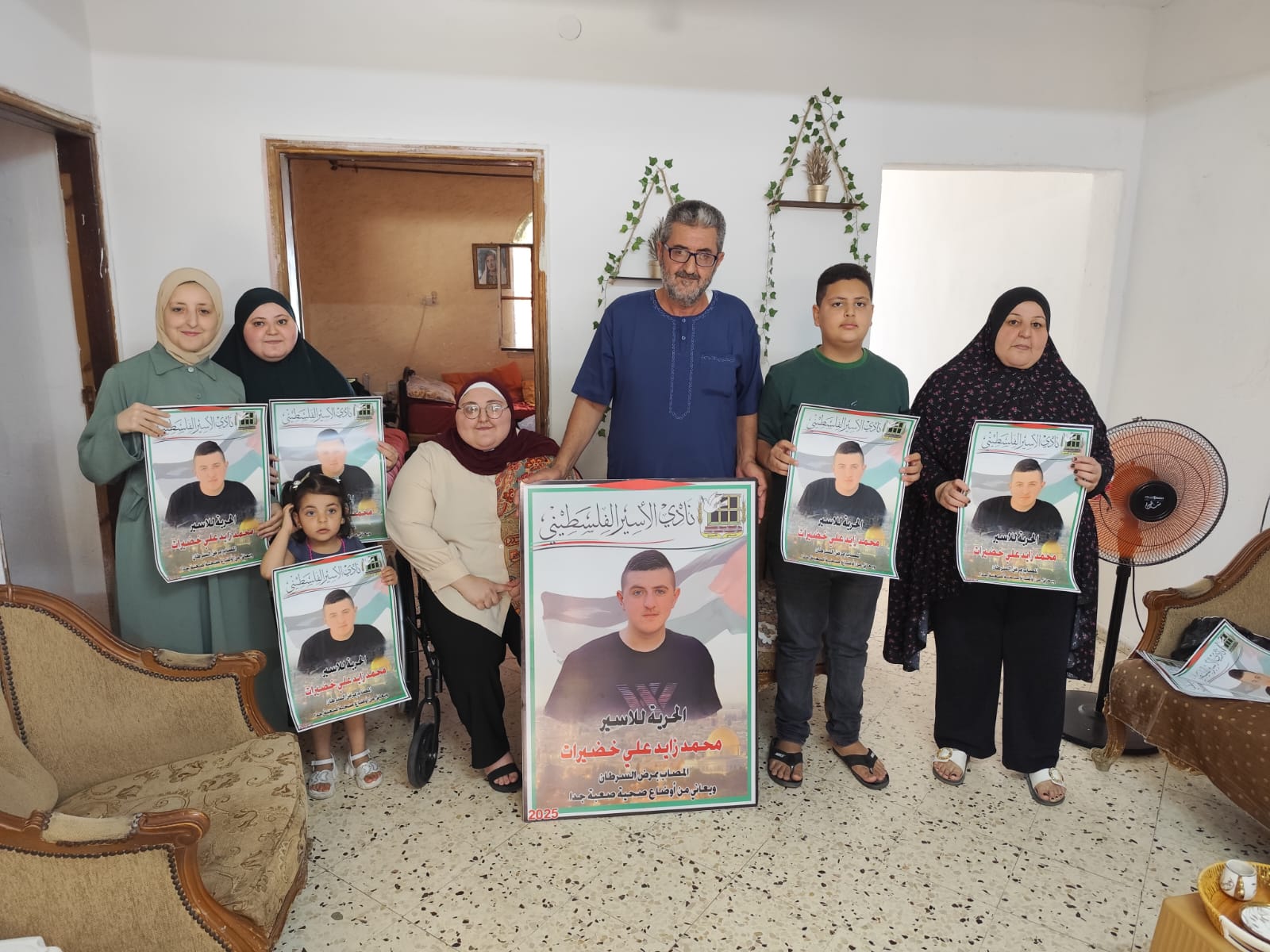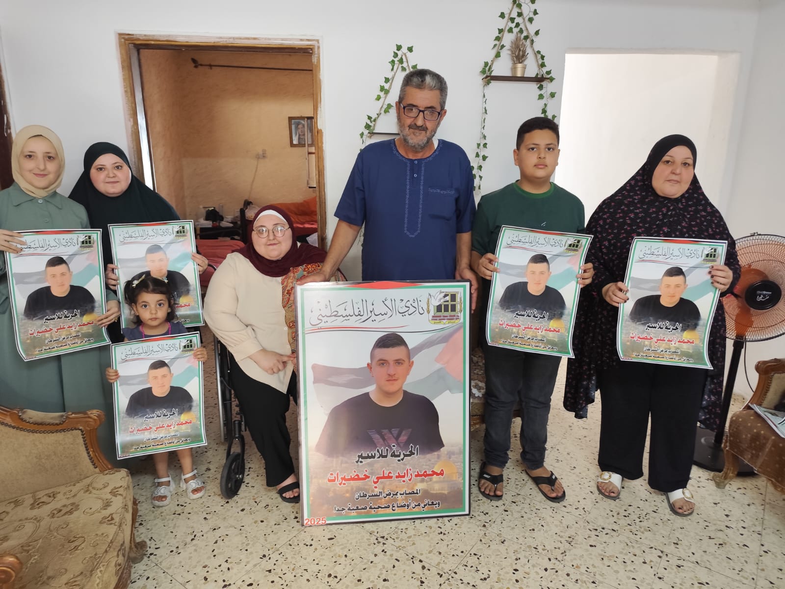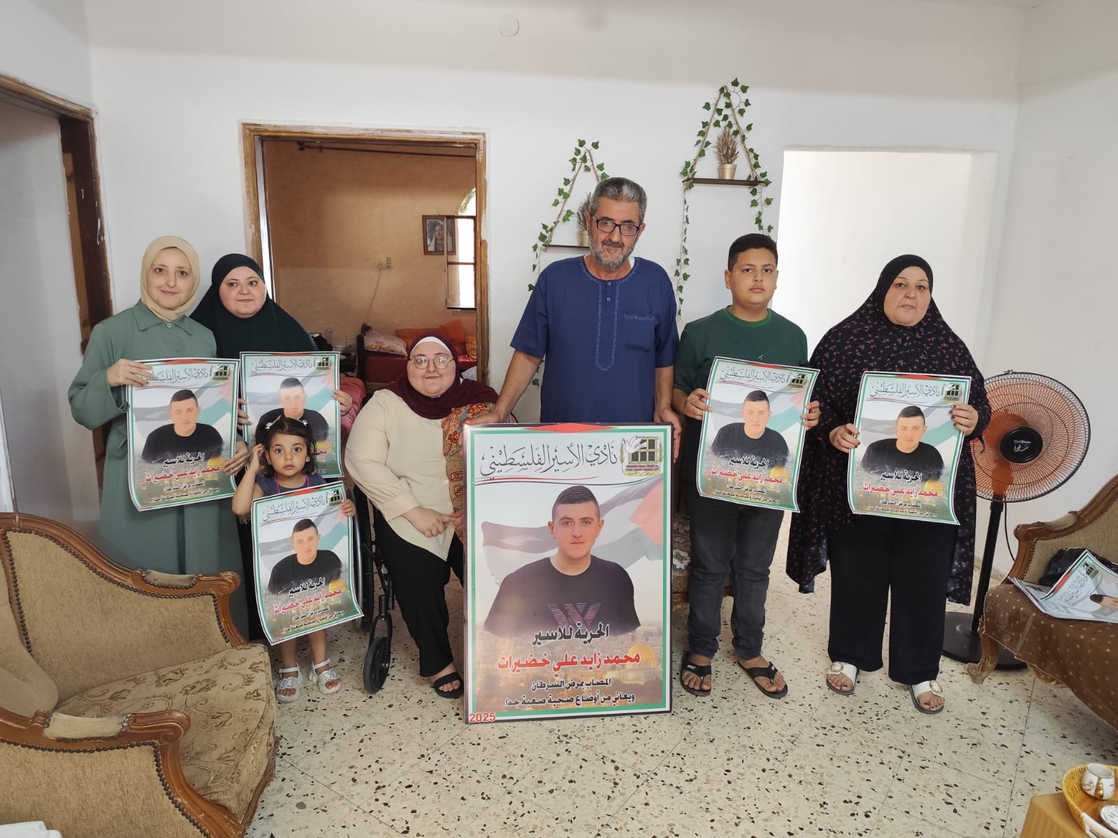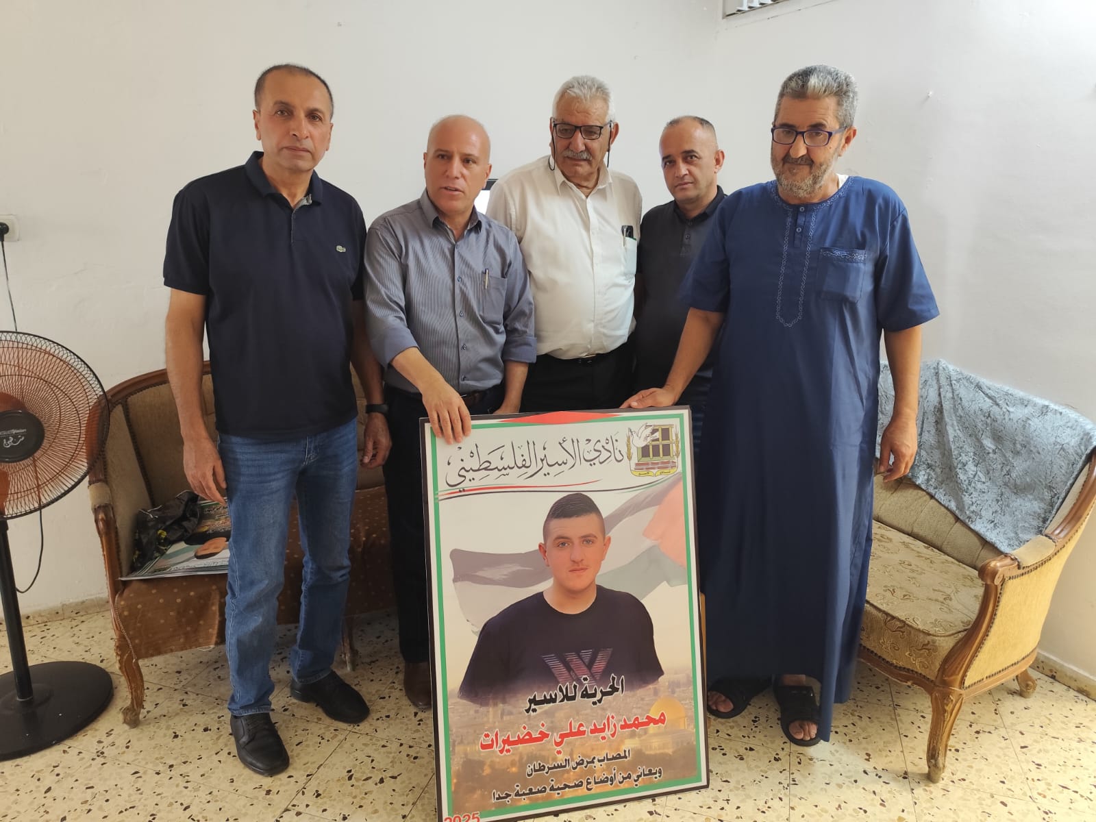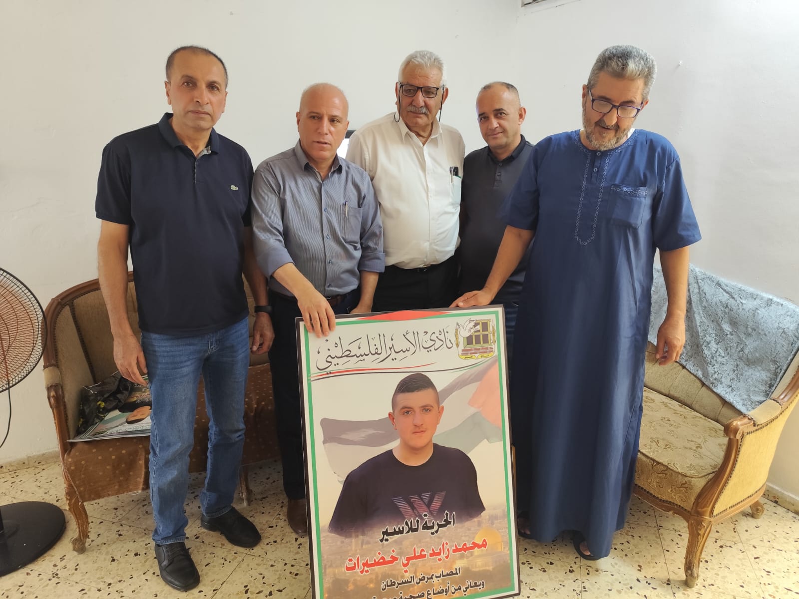 الخليل – في إطار التضامن مع الأسرى المرضى في سجون الاحتلال، قام وفد من نادي الأسير الفلسطيني وحركة فتح – منطقة الظاهرية التنظيمية، بزيارة تضامنية إلى منزل عائلة الأسير الفتى محمد زايد خضيرات (21 عامًا) في بلدة الظاهرية جنوب الخليل، والذي يعاني من مرض السرطان ويقبع في سجون الاحتلال بظروف صحية صعبة.