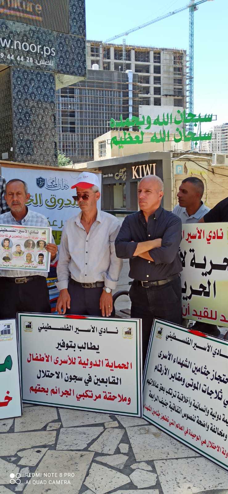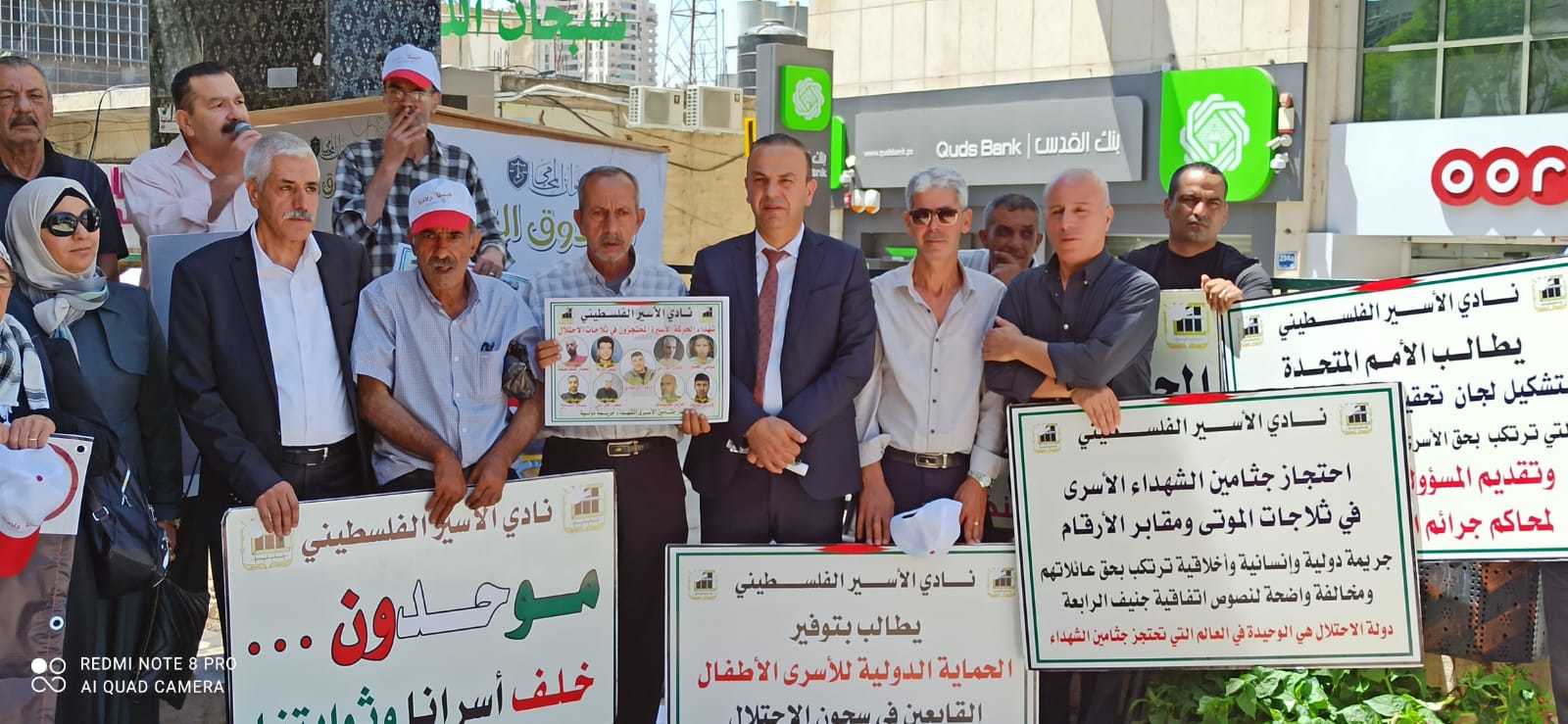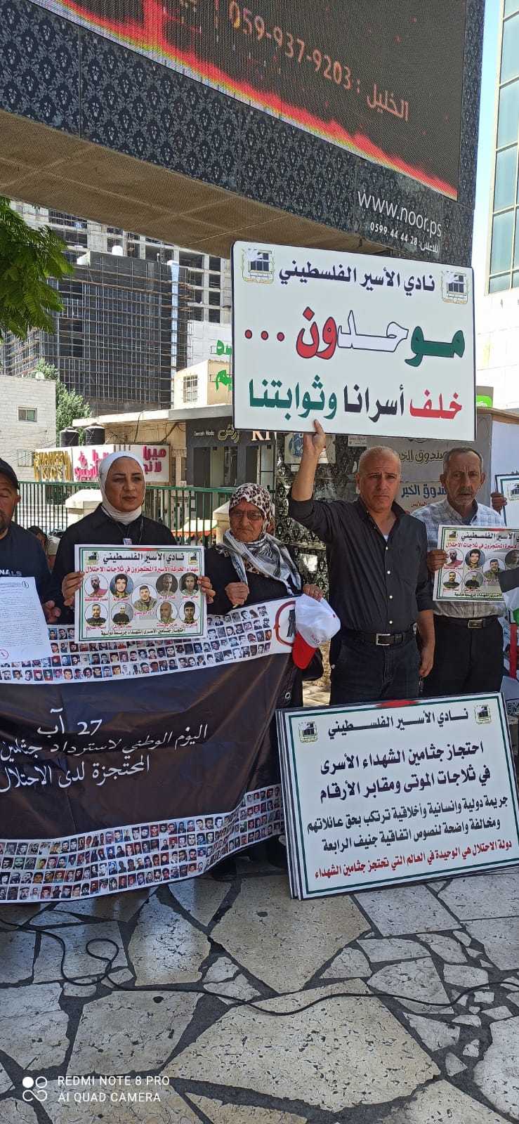 جانب من الوقفة اليوم السبت على دوار ابن رشد في الخليل دعما وإسنادا للأسرى في خطواتهم وللمطالبة باسترداد جثامين الشهداء في اليوم الوطني الخاص بهم