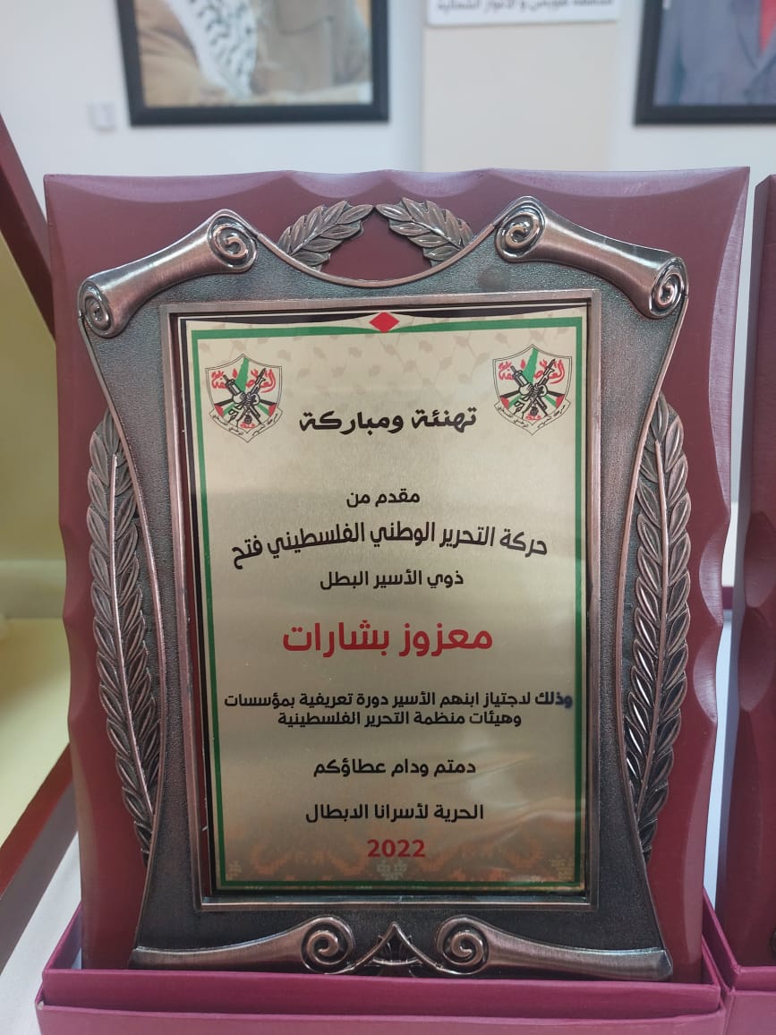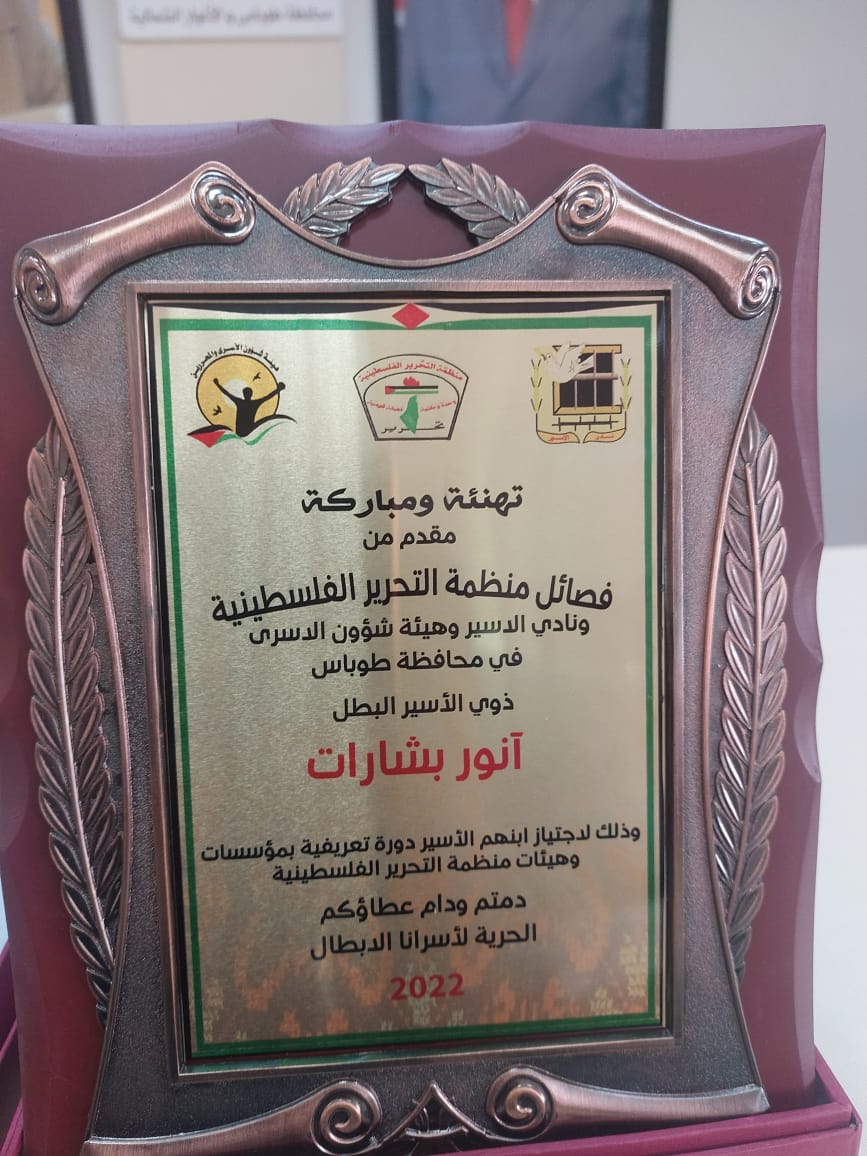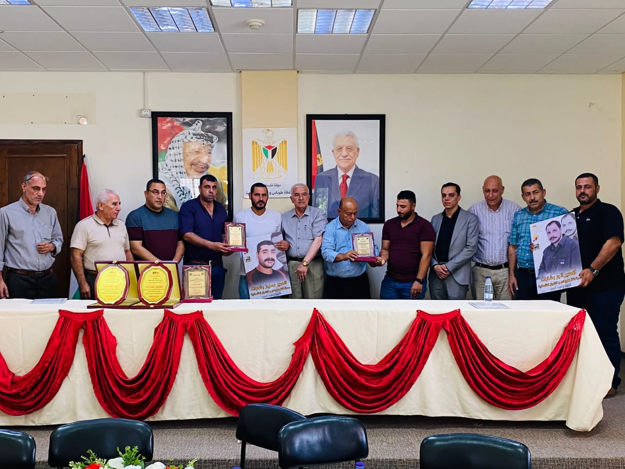 تكريم ذوي الاسيرين أنور ومعزوز بشارات من قبل محافظه طوباس ونادي الأسير الفلسطيني وهيئه شؤون الأسرى والمحررين ولجنه التنسيق الفصائلي لأجتيازهم دوره تعريفيه بمؤسسات وهيئات منظمه التحرير الفلسطينيه بواقع ٤٠ ساعه في سجن ريمون