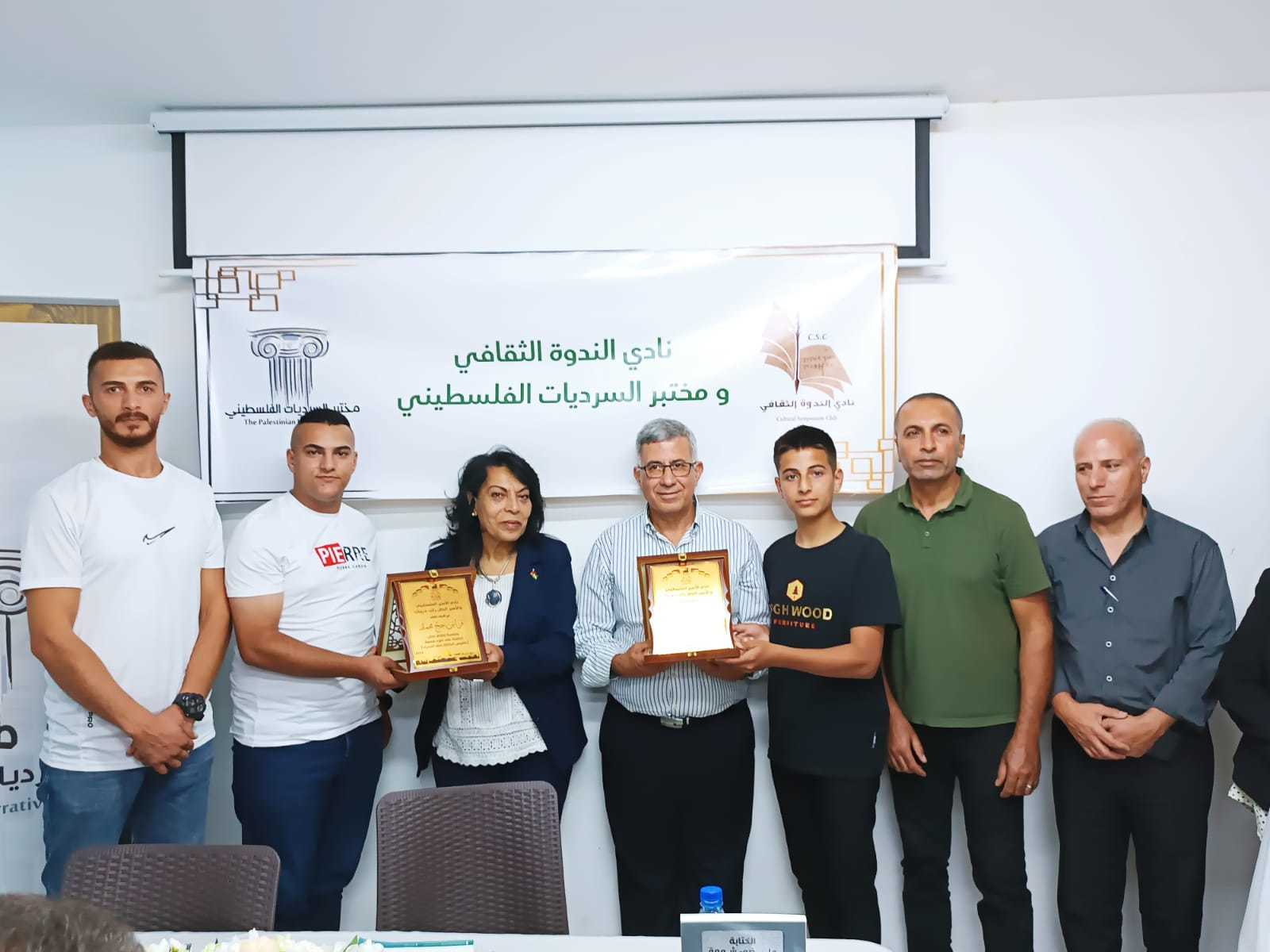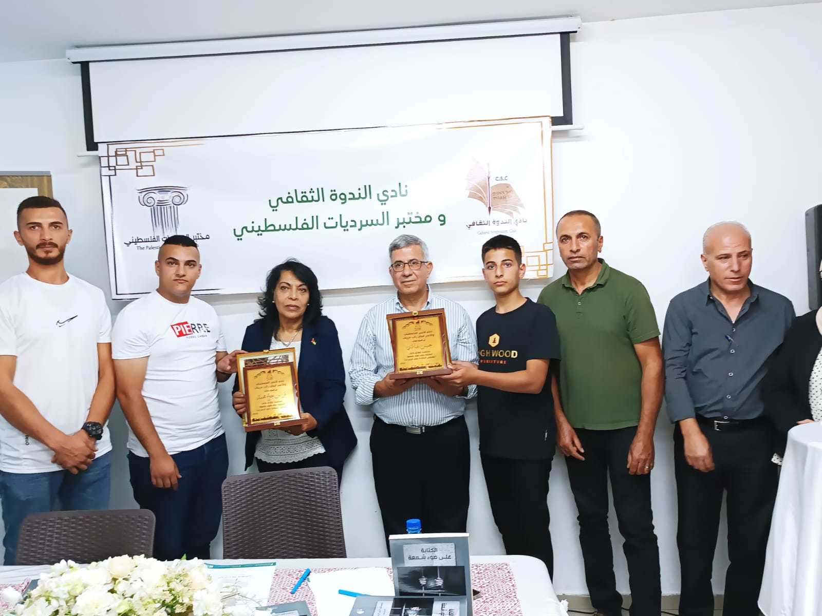 وقام امجد النجار وحسام ابو علان ممثلا عن نادي الاسير الفلسطيني والاسيرين المحررين جهاد الشحاتيت والغضنفر ابو عطوان وبناء على تكليف من الاسرى ( راتب حريبات ، خليل ابو عرام ، معتز الهيموني وايمن الشرباتي بتتقديم دروع تكريمية للكاتبين حسن عبادي وفراس حج محمد تقديرا لدعمهم الدائم والمتواصل لابداعات الاسرى داخل السجون .