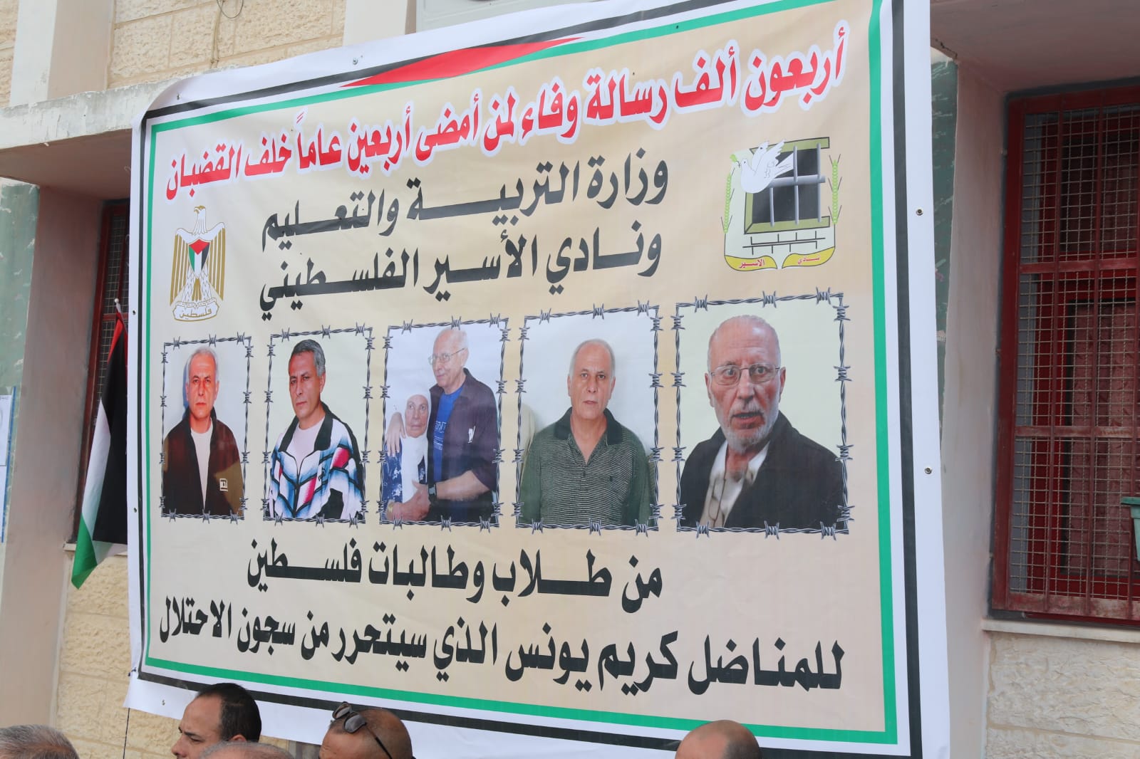 (40 ألف رسالة من طلبة فلسطين وفاءً للأسير كريم_يونس.... تحت هذا العنوان أعلن نادي الأسير الفلسطيني ومديرية التربية والتعليم في محافظة بيت لحم ظهر ، اليوم، عن انطلاقة حملة رسائل العهد والوفاء للاسير القائد كريم يونس عميد أسرى فلسطين وذلك تزامنًا مع اقتراب موعد الإفراج عنه المقرر في الخامس من كانون الثاني/ يناير المقبل، وذلك بعد ان أمضى مدة محكوميته البالغة 40 عامًا،