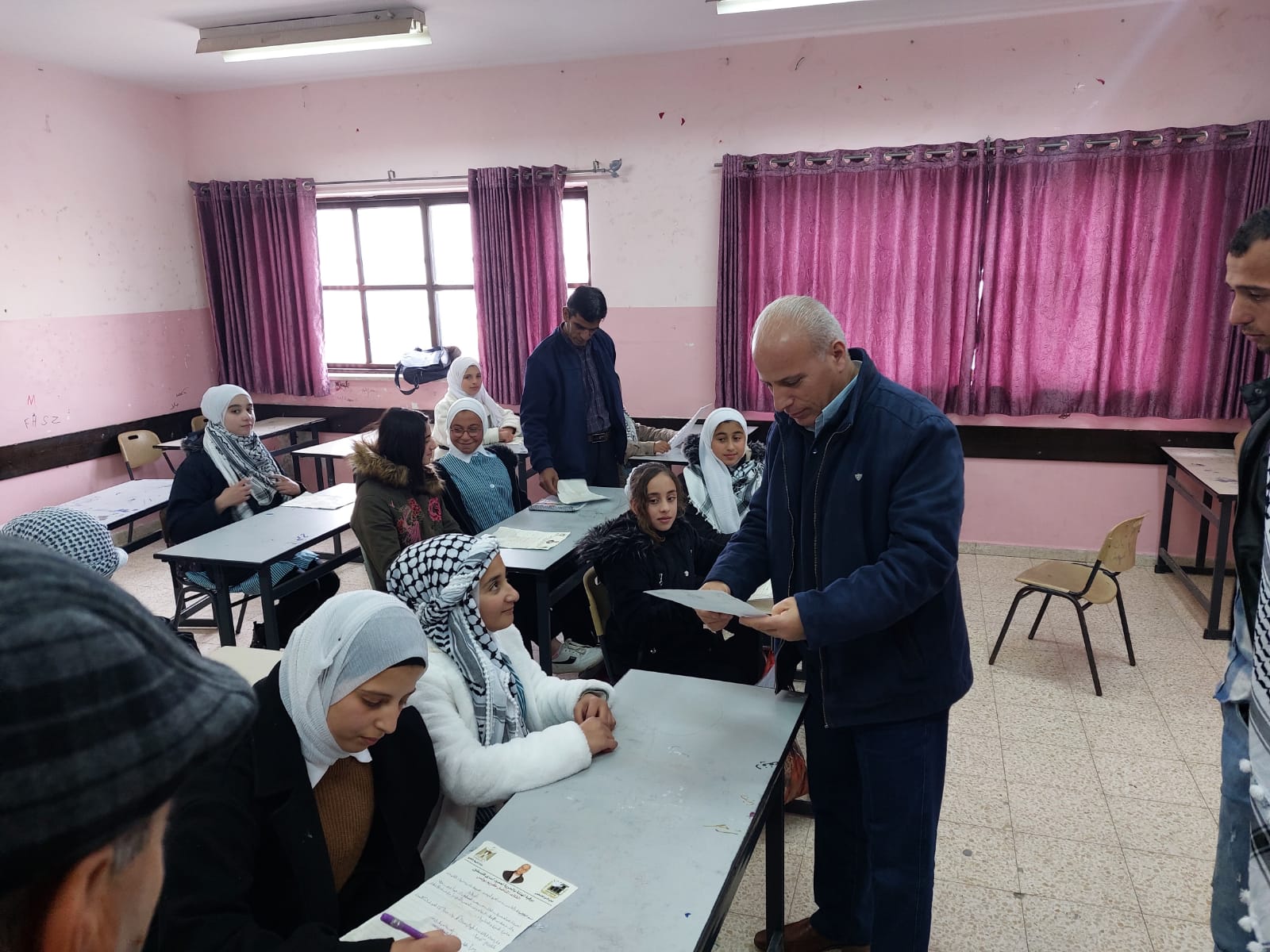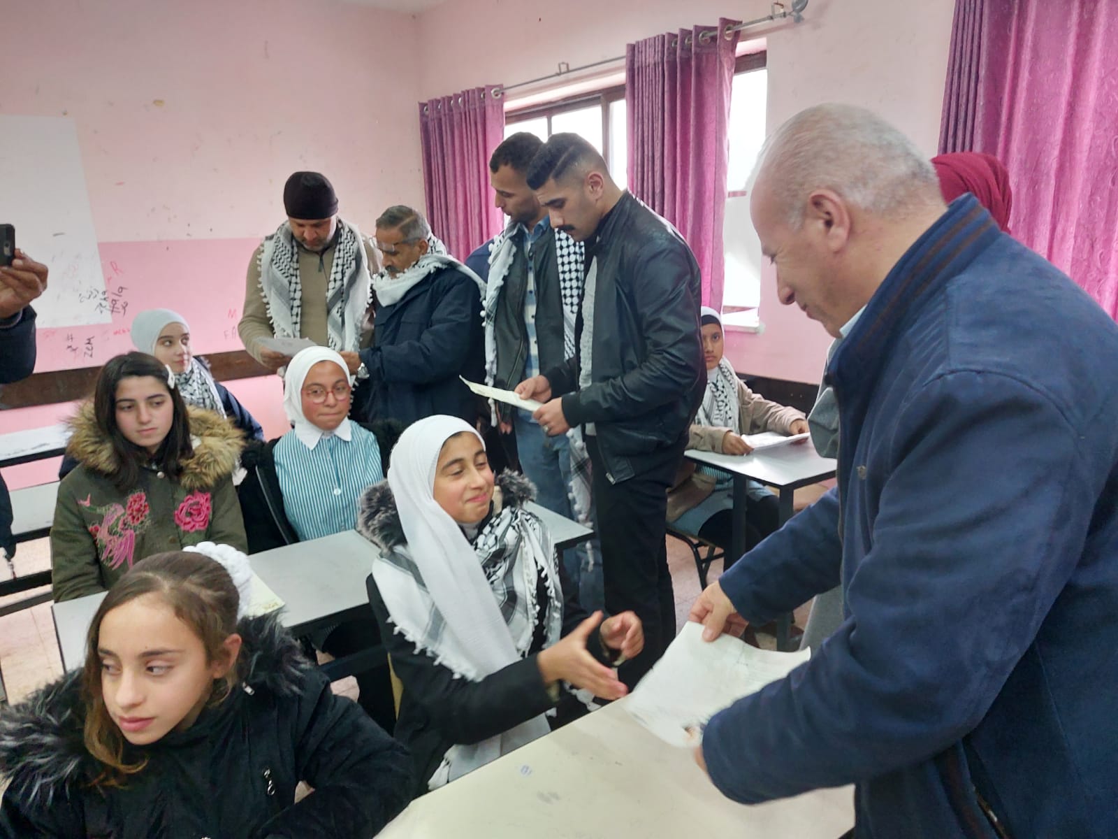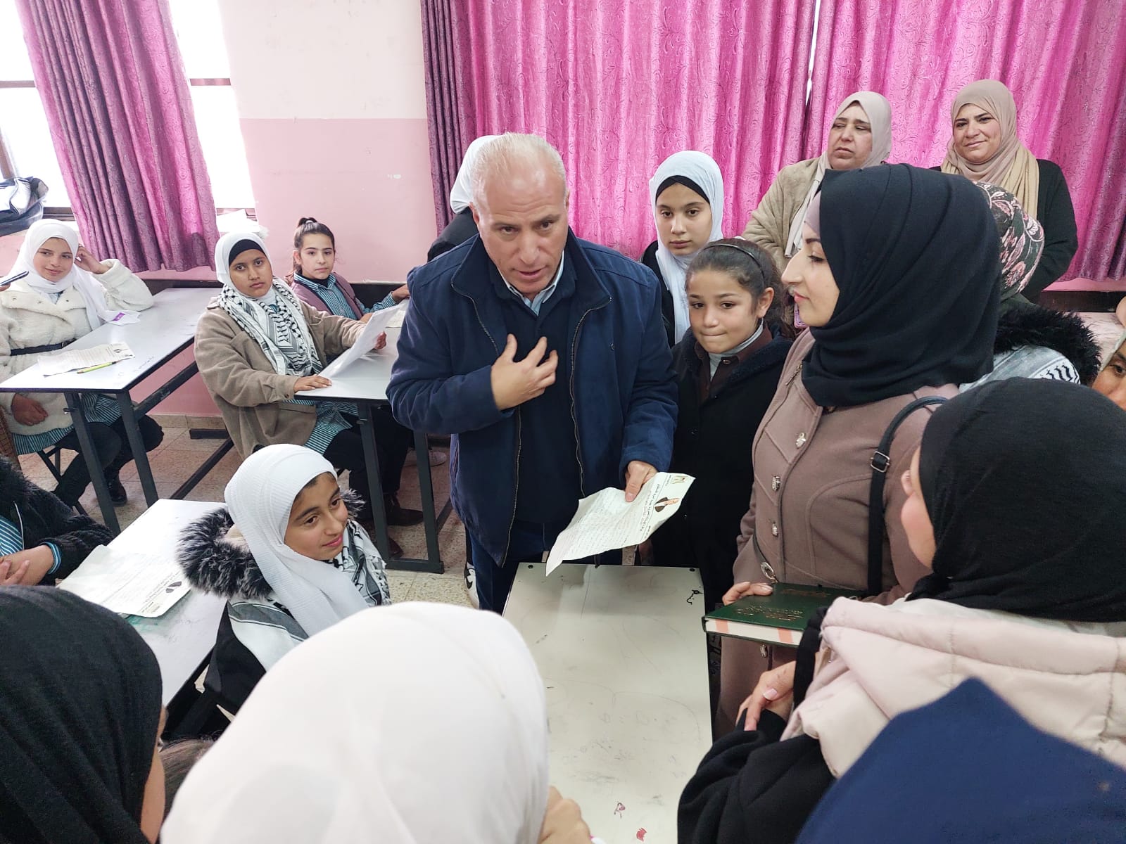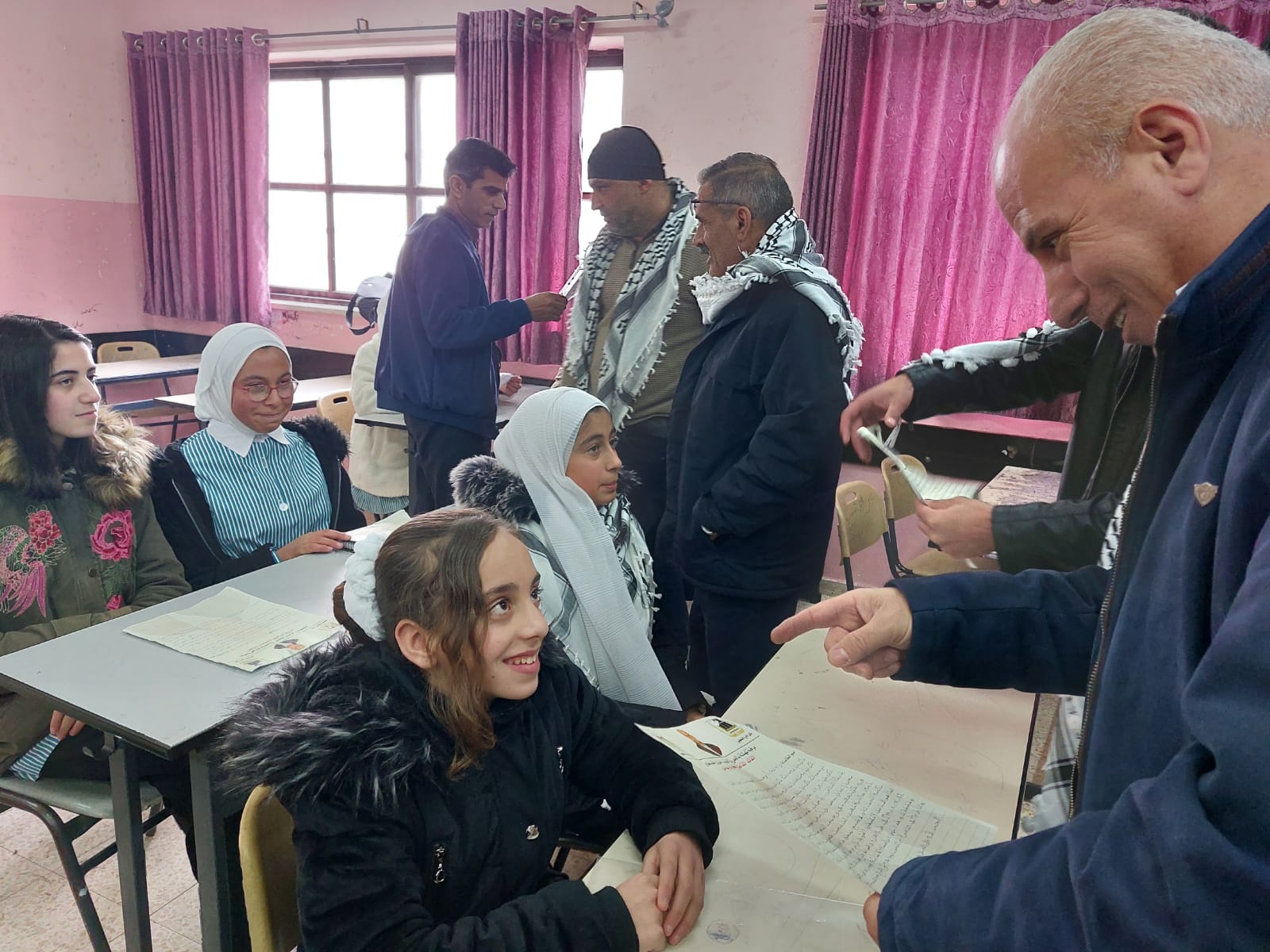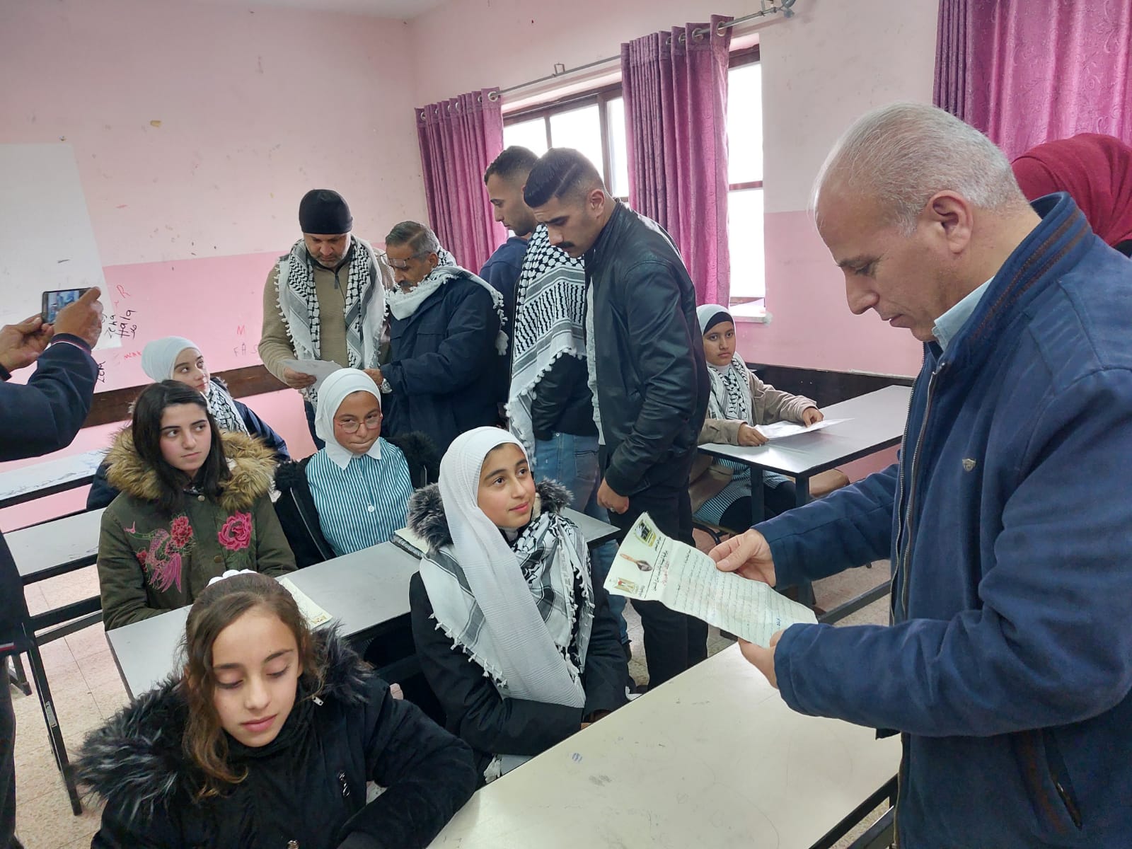 وفي نهاية الحفل الوطني قام منظموا الحفل مع مديرية التربية والتعليم وقيادة اقليم يطا بجولة داخل صفوف المدرسة حيث تقوم الطالبات باعداد الرسوم المعبرة عن نضال الاسير كريم يونس وكتابة برقيات التهنئة لعميد الاسرى كريم يونس حيث عبر الجميع عن تقديرهم الكبير للكلمات والرسومات التي خطتها الطالبات مما يعزز ان كل المحاولات لشطب تاريخ فلسطين من عقول طلابنا بائت بالفشل حيث ان الثقافة الوطنية كانت واضحة في كلمات الطالبات التي كتبت في برقيات التهنئة ...