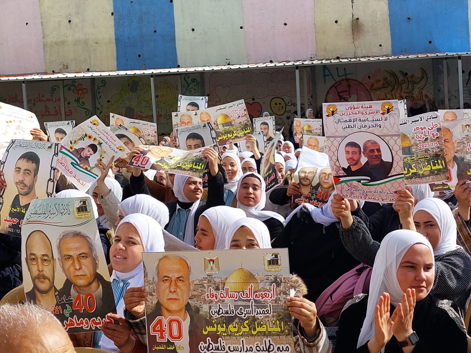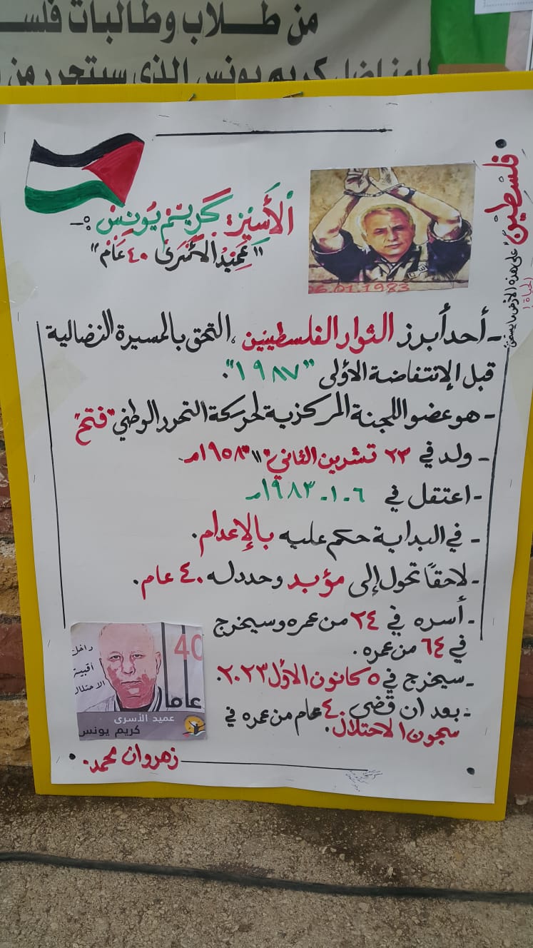 والقت الطالبة شهد محمد ابو زهرة قصيدة مؤثرة عن صمود الاسرى وطالبة اخرى استعرضت تاريخ المناضل الكبير كريم يونس وطالبة اخرى قدمت فقرة غنائية تشيد بصمود الاسرى ...