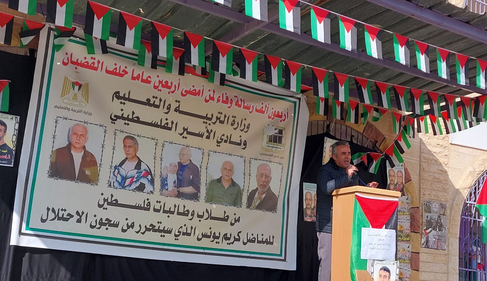 وفي كلمة ابراهيم النجار مدير هيئة شؤون الاسرى مشيدا بدور وزارة التربية والتعليم في تعميق الرساله الوطنية وخاصة في ملف الاسرى والاسيرات وان ها الحفل الوطني هو اكبر تعبير عن الدور الكبير للتربية والتعليم في تعزيز المفاهيم الوطنية وان اقتراب حرية كريم يونس تستدعي ان يقف الشعب الفلسطيني تقديرا لهذا الرجل الذي قضى من عمره اربعون عاما خلف القضبان وفقد والديه في سجون الاحتلال ....