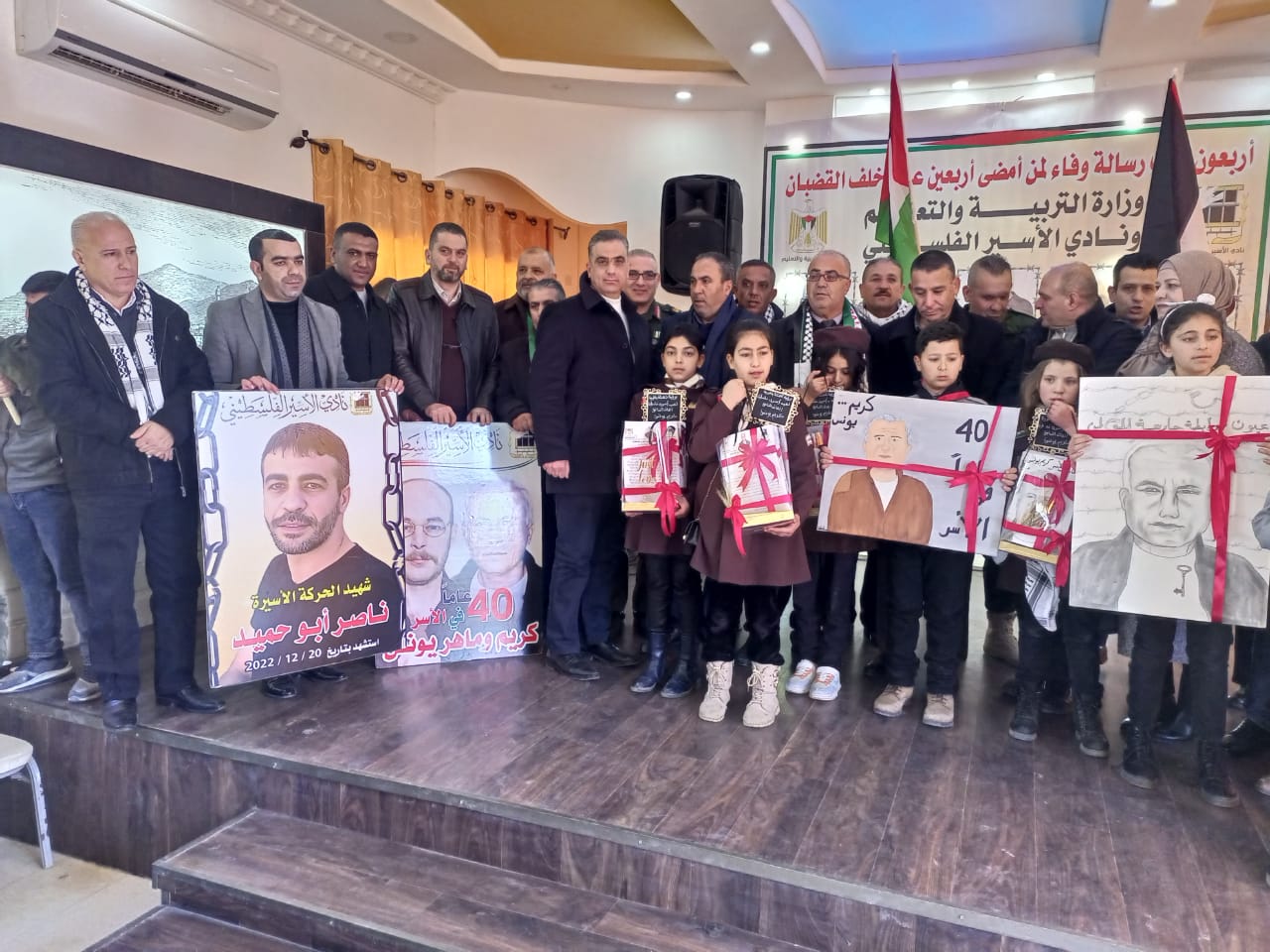 وفي كلمة امجد النجار مدير دائرة الاعلام في نادي الاسير ومنسق حملة اربعون الف برقية تهنئة لعميد اسرى فلسطين كريم يونس موجها التحية لكل من عمل على انجاح فعاليات الوفاء للاسير كريم يونس موضحا ان نادي الأسير الفلسطيني، بالتعاون مع وزارة التربية والتعليم اطلق حملة "40 ألف رسالة وفاء من طلبة فلسطين إلى عميد الأسرى كريم يونس" مع اقتراب موعد حريته بعد 40 عاما من الأسر، في سجون الاحتلال الإسرائيلي.
