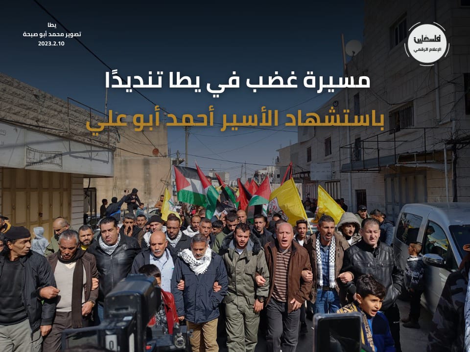 مسيرة غاضبة في مدينة يطا تنديدا بجريمة الاهمال الطبي المتعمد والتي ادت الى استشهاد الاسير أحمد بدر أبو علي