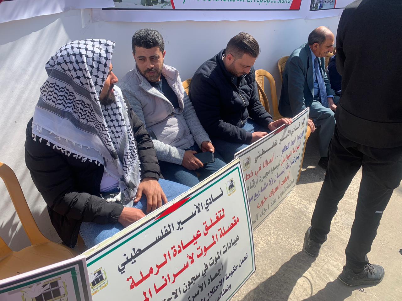 ورفع المشاركون لافتات تجرم اجراءات الاحتلال بحق الأسرى، وأخرى تساند الأسرى في مطالبهم وحقوقهم، وأخرى تطالب المنظمات الحقوقية الدولي بالوقوف إلى جانب الأسرى وتجريم اجراءات الاحتلال.