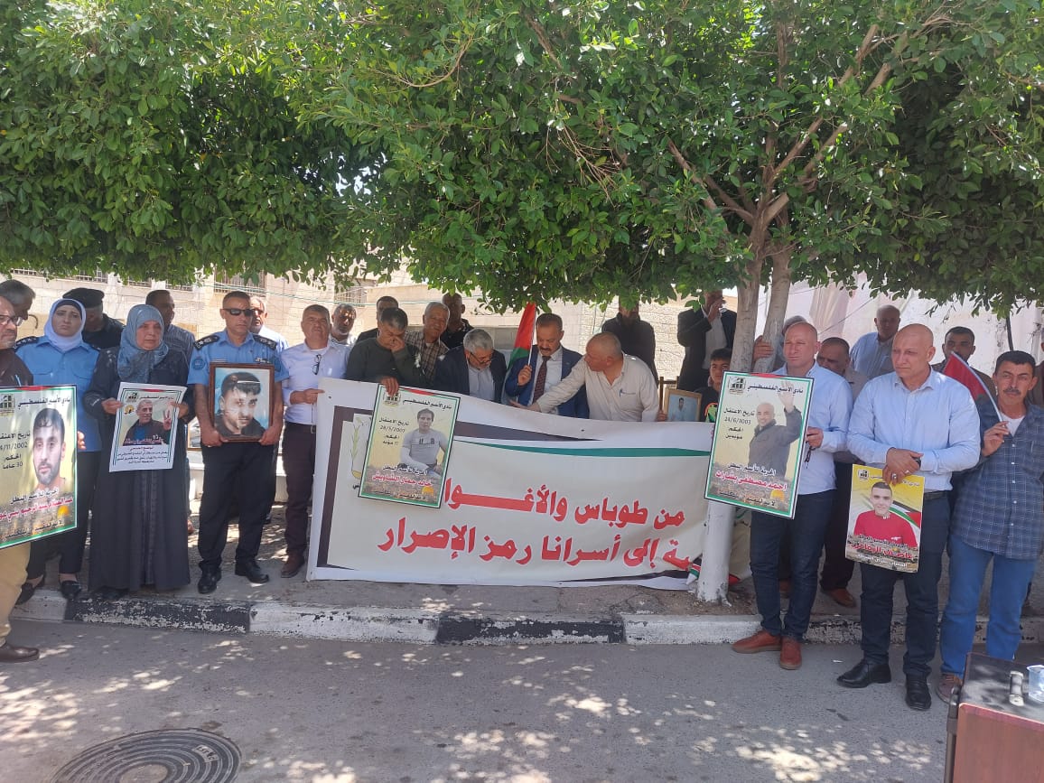 طوباس 10-5-2023 وفا- شاركت فعاليات طوباس، اليوم الأربعاء، في وقفة إسناد للأسرى المرضى في سجون الاحتلال، بدعوة من نادي الأسير، وهيئة شؤون الأسرى والمحررين، ولجنة التنسيق الفصائلي.