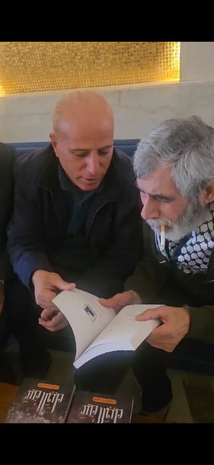 عميد الأسرى الفلسطينيين المحرر بعد 39 عاما محمد الطوس يلمس نسخة من كتابه عين الجبل لأول مرة بعد تحرره