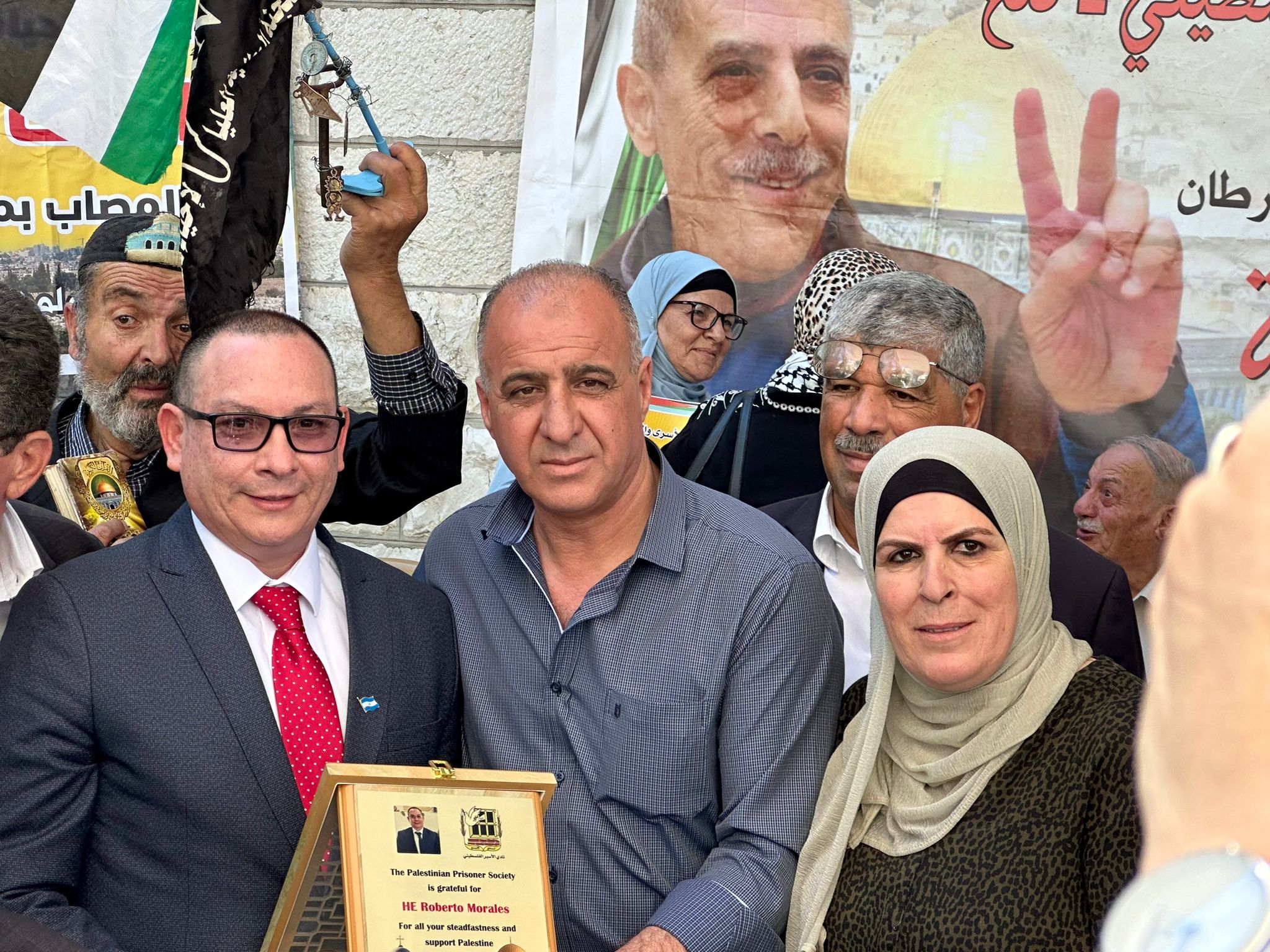 نائب رئيس نادي الأسير الفلسطيني عبدالله زغاري يُكرم سفير دولة نيكاراغوا (روبيرتو موراليس)، والذي أنهى عمله كسفير لبلده في فلسطين، تقديراً لجهوده في دعم قضايا الأسرى.