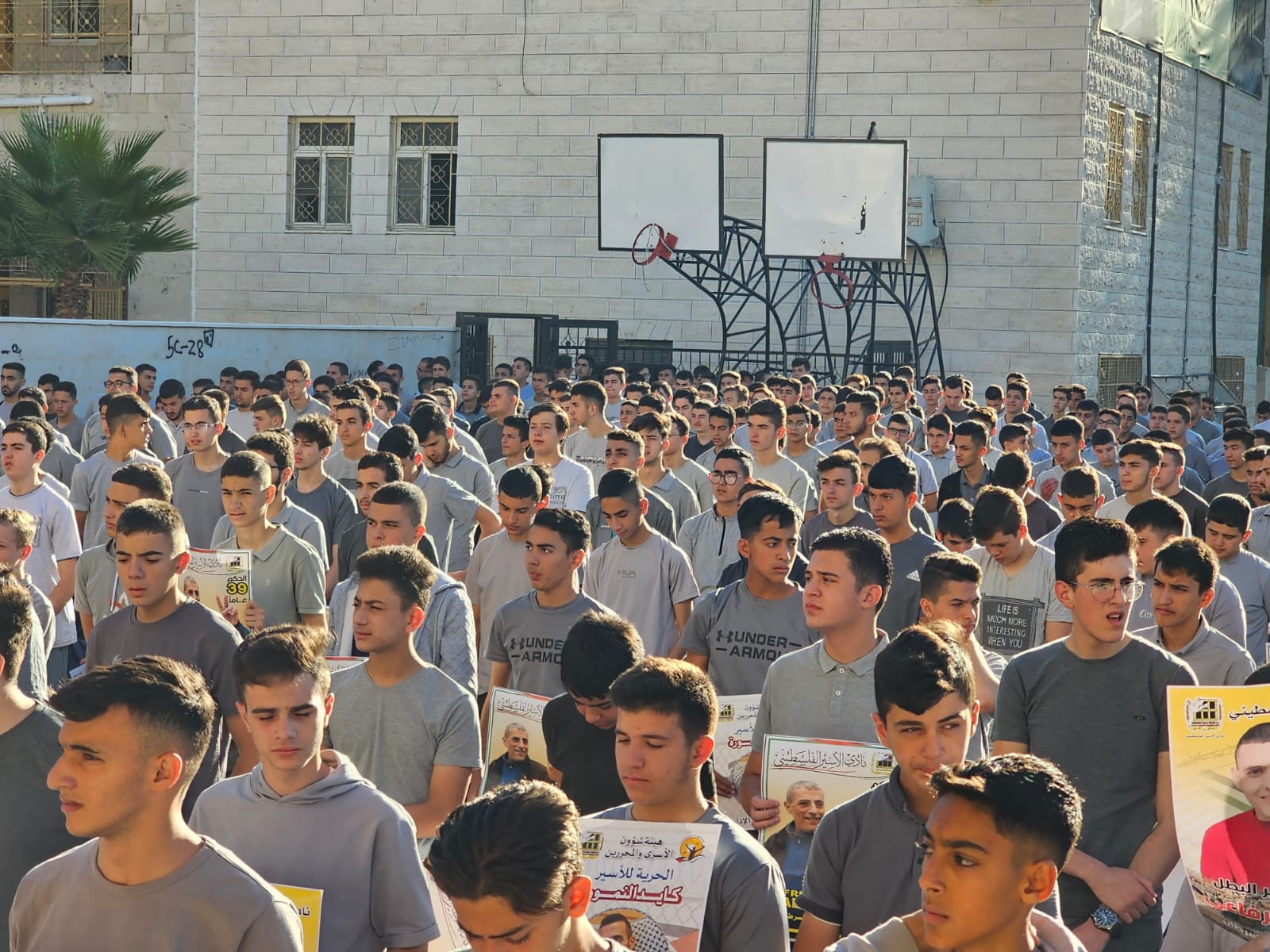 وقفــة صباحيـة مـن طـلاب مـدرســة الحسين الثانويــة مـع الأســير المـريض بـالــسرطان عـاصـف الـرفـاعــي والأسرى المضربين ..ِ
