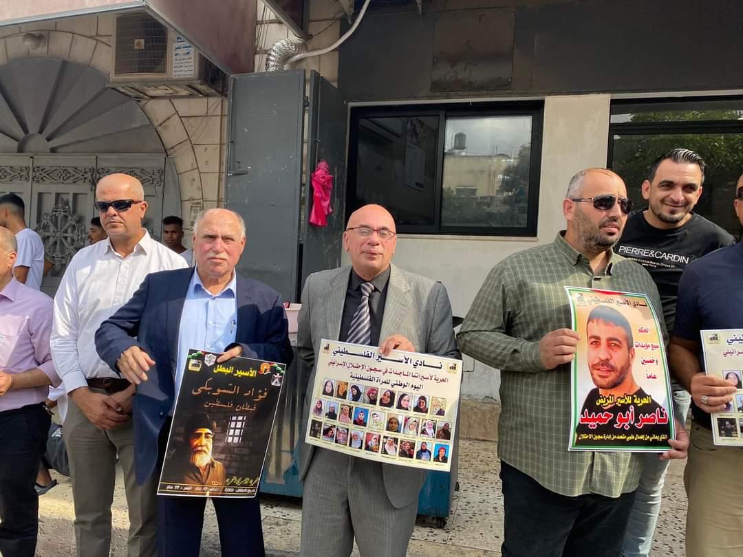 جانب من الوقفة الإسنادية للأسرى في سجون الاحتلال اليوم الثلاثاء من أمام الصليب الأحمر/طولكرم.
