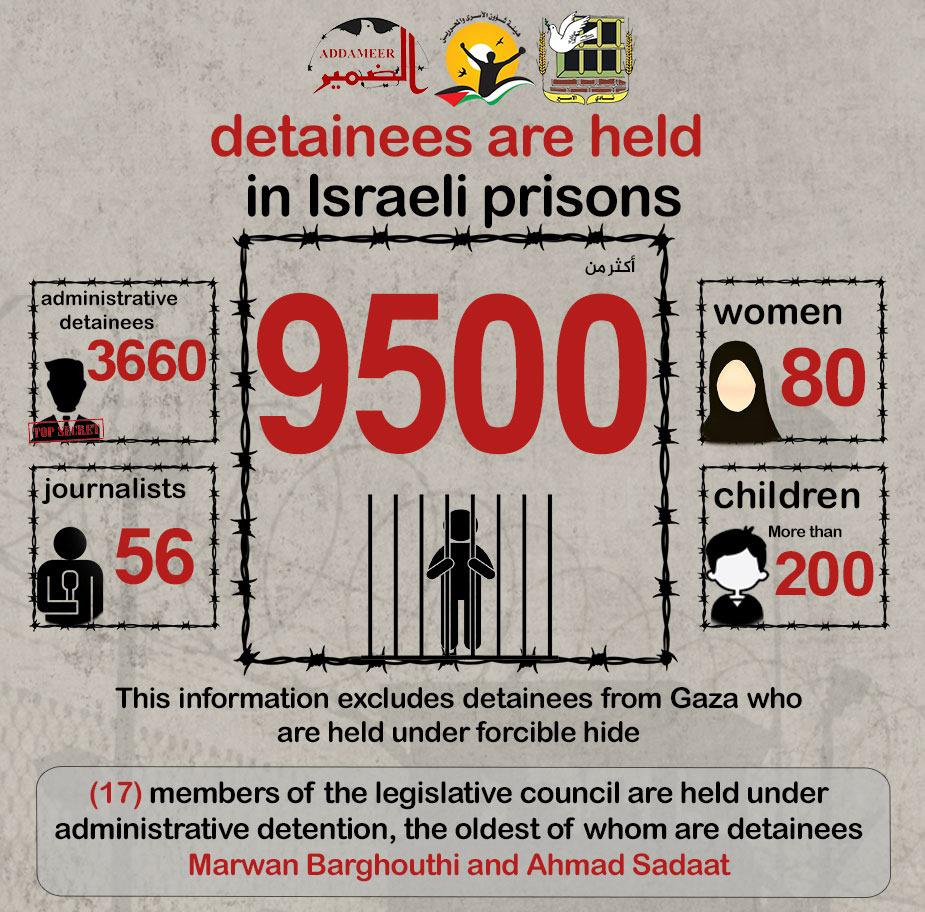 Total Prisoners: Today, the number of prisoners in Israeli occupation prisons exceeds 9,500 detainees. This figure does not include all Gaza detainees who are subjected to the crime of enforced disappearance.