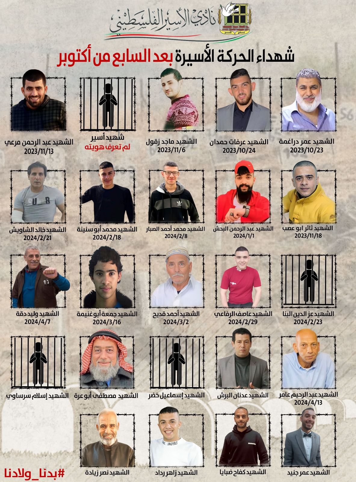 نادي الأسير: باستشهاد المعتقل نصر زيارة من غزة في سجون الاحتلال، فإن عدد الشهداء بين صفوف الأسرى والمعتقلين المعلن عنهم بعد تاريخ السابع من أكتوبر، منذ بدء حرب الإبادة بحقّ شعبنا في غزة يرتفع إلى (24) شهيداً، وهم المعلن عنهم فقط والمعروفة هوياتهم، فيما يواصل الاحتلال إخفاء هويات العشرات من الشهداء بين صفوف المعتقلين الذين ارتقوا في السجون والمعسكرات، ولا يوجد رقم نهائي ودقيق لأعدادهم حتى اليوم، هذا عدا عن معتقلين تعرضوا لعمليات إعدام ميدانية.