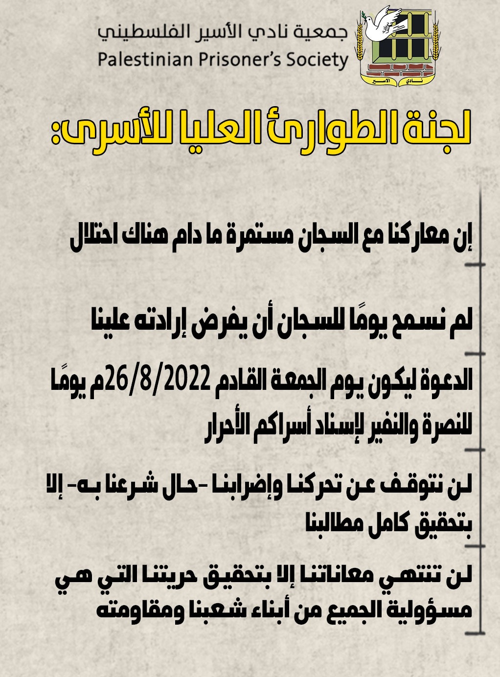 • ومؤخرًا عادت إدارة السّجون التلويح ببعض الإجراءات ومضاعفة بعضها، الأمر الذي فرض على الأسرى حتمية استئناف المواجهة من جديد عبر تفعيل خطواتهم النضالية، والتي قد تنتهي مطلع أيلول القادم بإضراب عن الطعام بمشاركة كافة الفصائل في السّجون.