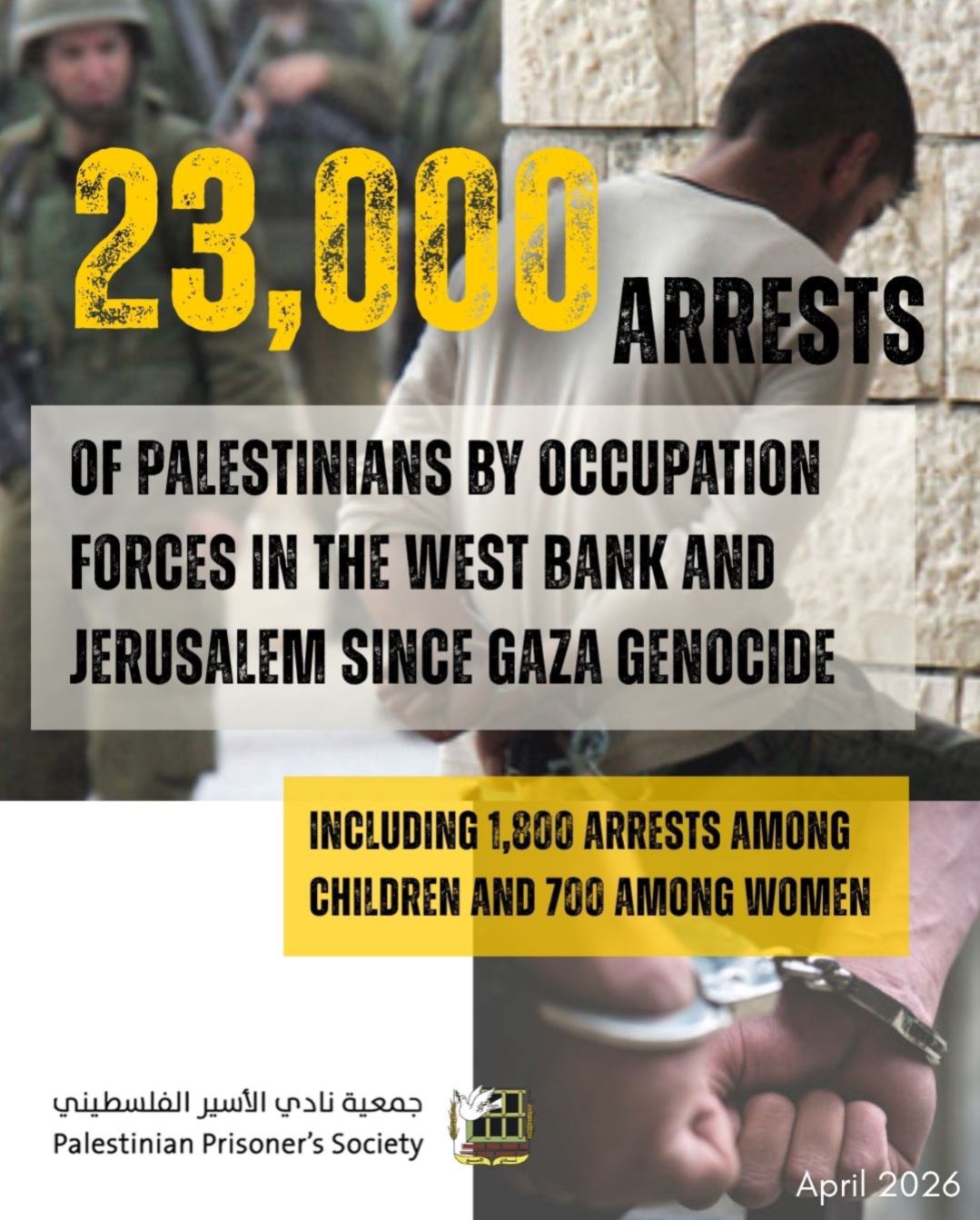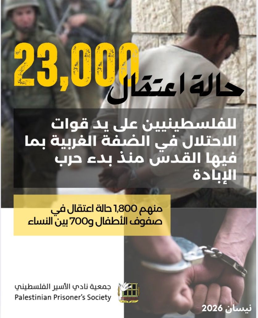 ⭕️ نادي الأسير: 23 ألف حالة اعتقال في الضّفة في أعقاب جريمة الإبادة الجماعية
