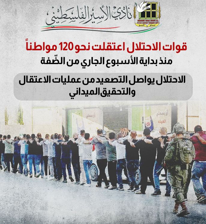 ⭕ نادي الأسير: قوات الاحتلال اعتقلت نحو 120 مواطناً منذ بداية الأسبوع الجاري من الضّفة
