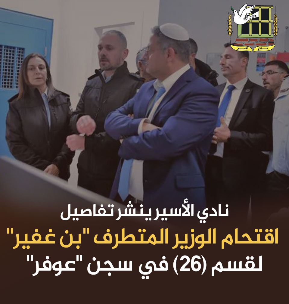 🔴 نادي الأسير ينشر تفاصيل اقتحام الوزير المتطرف "بن غفير" لقسم (26) في سجن "عوفر"