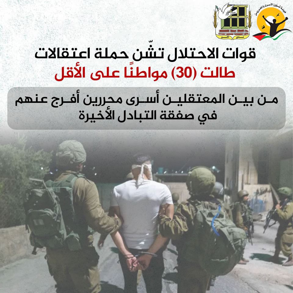 📌 قوات الاحتلال تشّن حملة اعتقالات طالت (30) مواطنًا على الأقل
