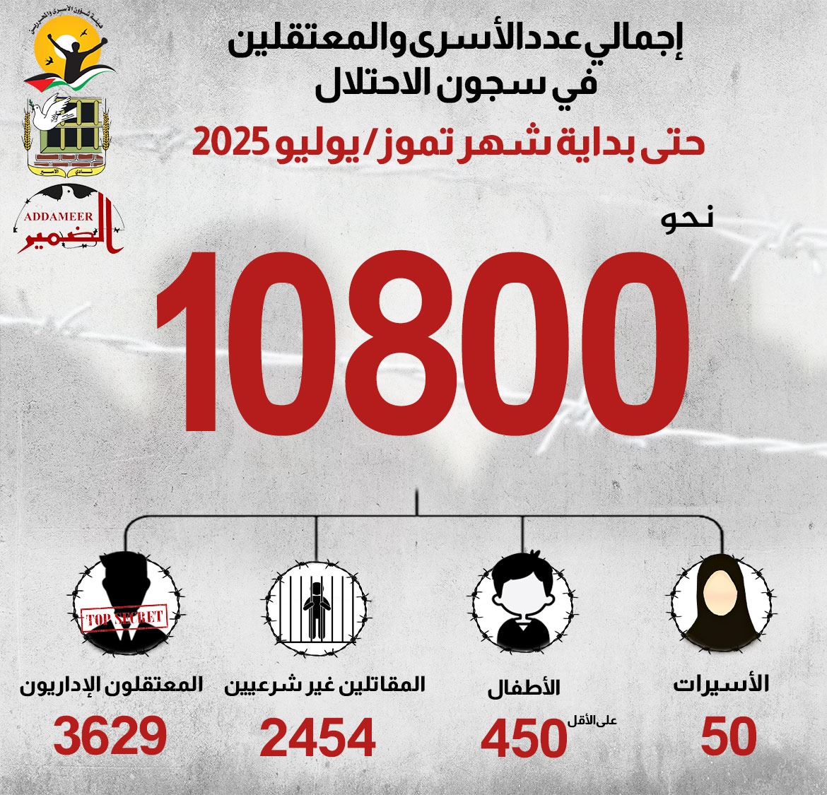 🔴 ارتفاع أعداد الأسرى والمعتقلين في معتقلات الاحتلال الإسرائيلي إلى نحو 10,800 أسير