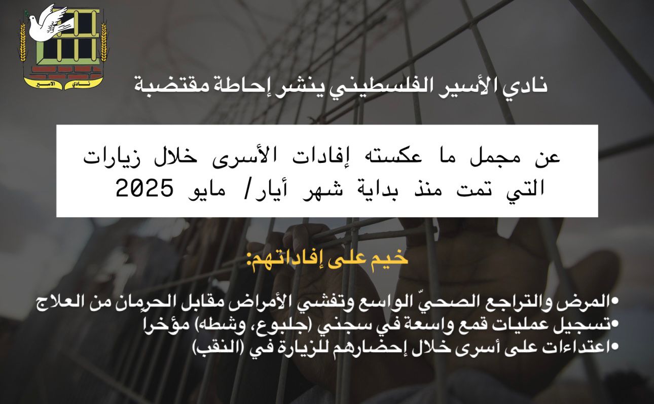 ⭕ نادي الأسير الفلسطيني ينشر إحاطة مقتضبة عن مجمل ما عكسته إفادات الأسرى خلال زيارات التي تمت منذ بداية شهر أيار/ مايو 2025