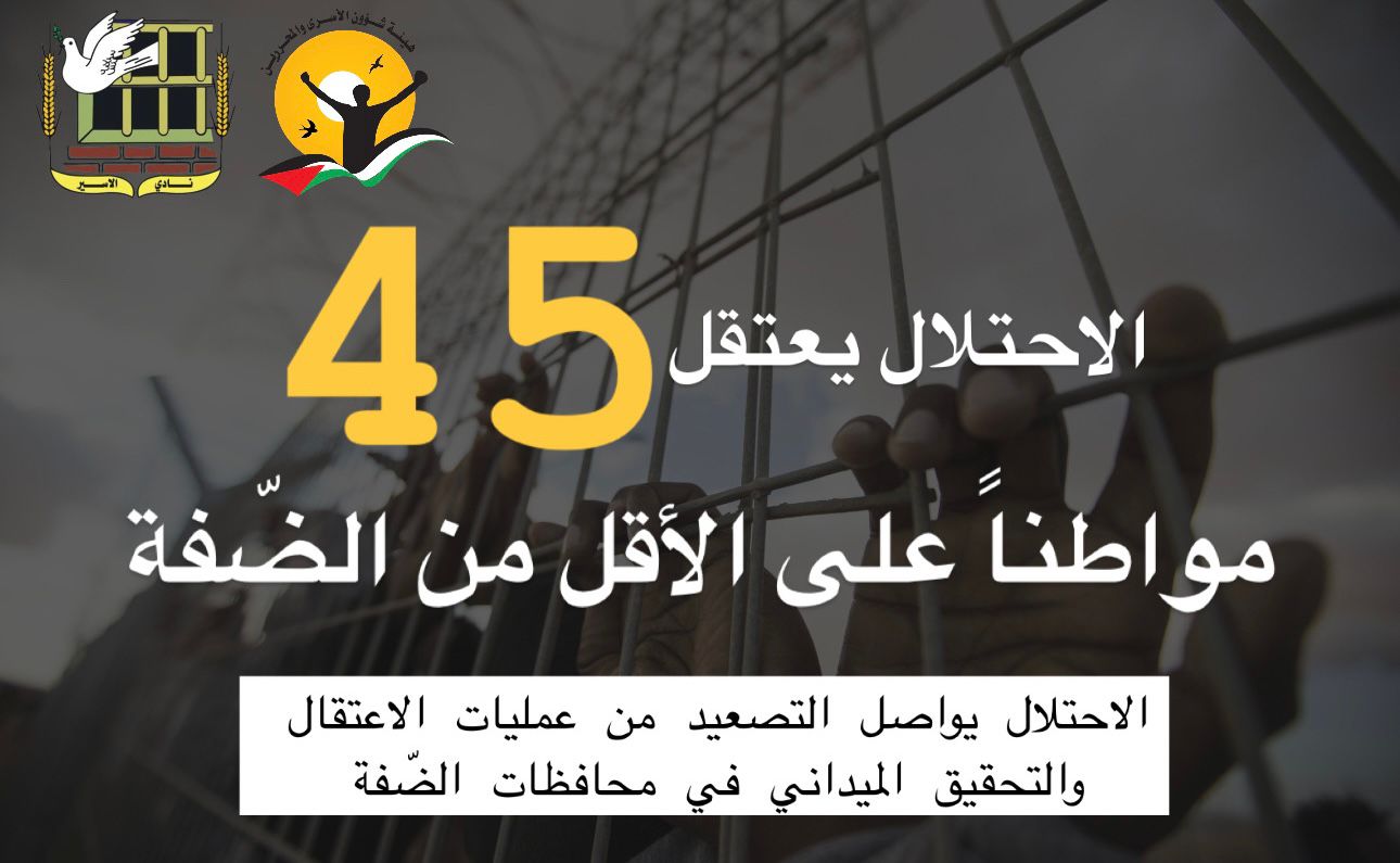 ▪ الاحتلال يعتقل 45 مواطناً على الأقل من الضّفة