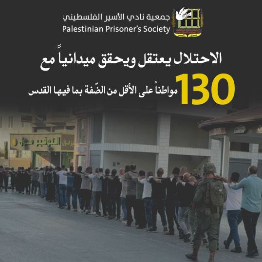 🔴 نادي الأسير: الاحتلال يعتقل ويحقق ميدانياً مع 130 مواطناً على الأقل من الضّفة بما فيها القدس