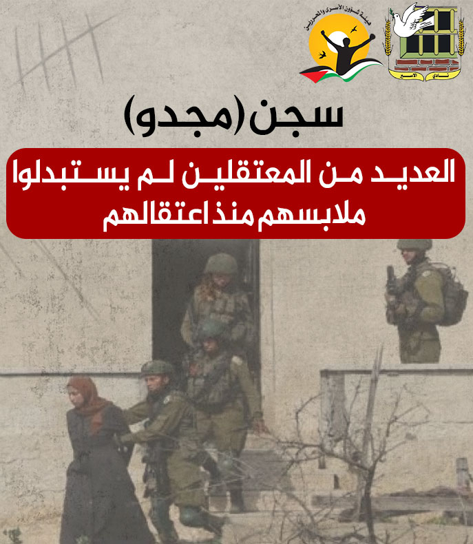 أكّد مجموعة من المعتقلين خلال زيارتهم في سجن (مجدو)، على أنّ أبرز القضايا القاسية التي تواجههم بشكل مضاعف مع مرور الزمن، إلى جانب جملة الانتهاكات، عدم توفر الملابس، فالعديد من المعتقلين لم يتمكنوا من استبدال ملابسهم منذ اعتقالهم، ورغم البرد القارس ما يزال العديد منهم دون ستر إضافية تقيهم من البرد، كما أنّ العديد منهم ظهرت عليهم بعض المشكلات الجلدية، وتحديدًا الفطريات بسبب عدم توفر أدوات النظافة الشخصية، وكذلك عدم توفر الملابس، كما وأجمع الأسرى الذين تمت زيارتهم على أنّ سياسة التّجويع ما تزال قائمة، وتتفاقم مع ازدياد أعداد المعتقلين الجدد، وتفاقم حالة الاكتظاظ الغير مسبوقة داخل الزنازين، فبعض وجبات الطعام تتكون فقط من علبة لبنة لكل (الغرفة- الزنزانة) والتي قد يصل عدد المعتقلين فيها لنحو 12 معتقلًا.