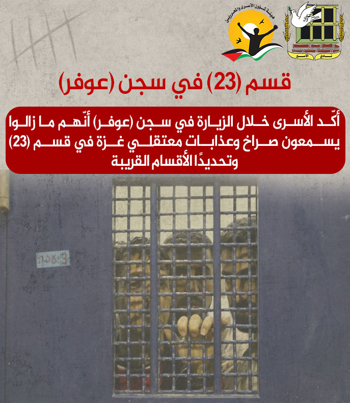 أكّد الأسرى خلال الزيارة في سجن (عوفر) أنّهم ما زالوا يسمعون صراخ وعذابات معتقلي غزة في قسم (23) وتحديدًا الأقسام القريبة، حيث يتعرضون لعمليات اقتحام متكررة ورش بالغاز، وعمليات تعذيب تعكسها أصوات الصراخ المتواصل.