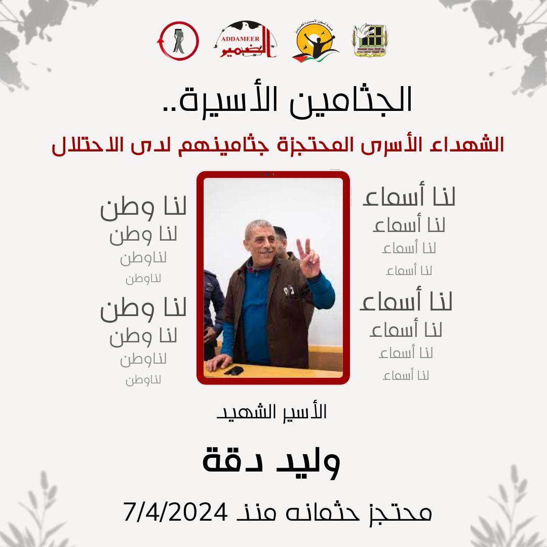 26. الأسير القائد الشهيد وليد دقة، محتجز جثمانه من تاريخ 7/4/2024، ارتقى بعد 38 عاماً من الاعتقال.