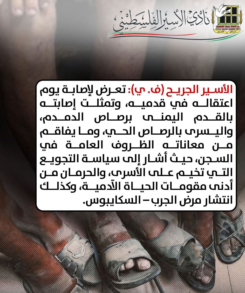 أما الأسير الجريح (ف. ي) فقد أفاد بأنه تعرض لإصابة يوم اعتقاله في قدميه، وتمثلت إصابته بالقدم اليمنى برصاص الدمدم، واليسرى بالرصاص الحي، وفي حينه نقل إلى مستشفى العفولة بعد اعتقاله، وأجريت له عملية، وبعد ذلك مكث في مستشفى (الرملة) لمدة شهرين، ثم خضع لعملية جراحية أخرى في قدمه، ونقل إلى سجن (مجدو) حيث مكث فيه لمدة 90 يوما، ثم نقل إلى سجن النقب، وما يزال يعاني من آثار الإصابة حتى اليوم، وما يفاقم من معاناته الظروف العامة في السجن، حيث أشار إلى سياسة التجويع التي تخيم على الأسرى، والحرمان من أدنى مقومات الحياة الآدمية، وتصاعد عمليات القمع والاقتحامات والتفتيشات المتكررة، والإهانات على مدار الوقت، وكذلك انتشار مرض الجرب – السكايبوس.
