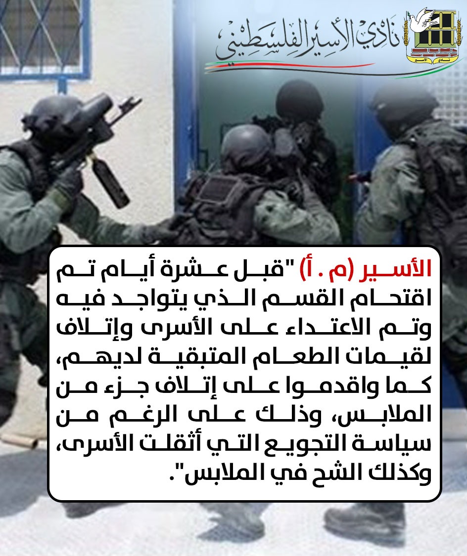 وهذا ما أكده الأسير (م . أ) "بالنسبة للأوضاع في السجن، فقبل عشرة أيام تم اقتحام القسم الذي يتواجد فيه وتم الاعتداء على الأسرى وإتلاف لقيمات الطعام المتبقية لديهم، كما وأقدموا على إتلاف جزء من الملابس، وذلك على الرغم من سياسة التجويع التي أثقلت الأسرى، وكذلك الشح في الملابس".