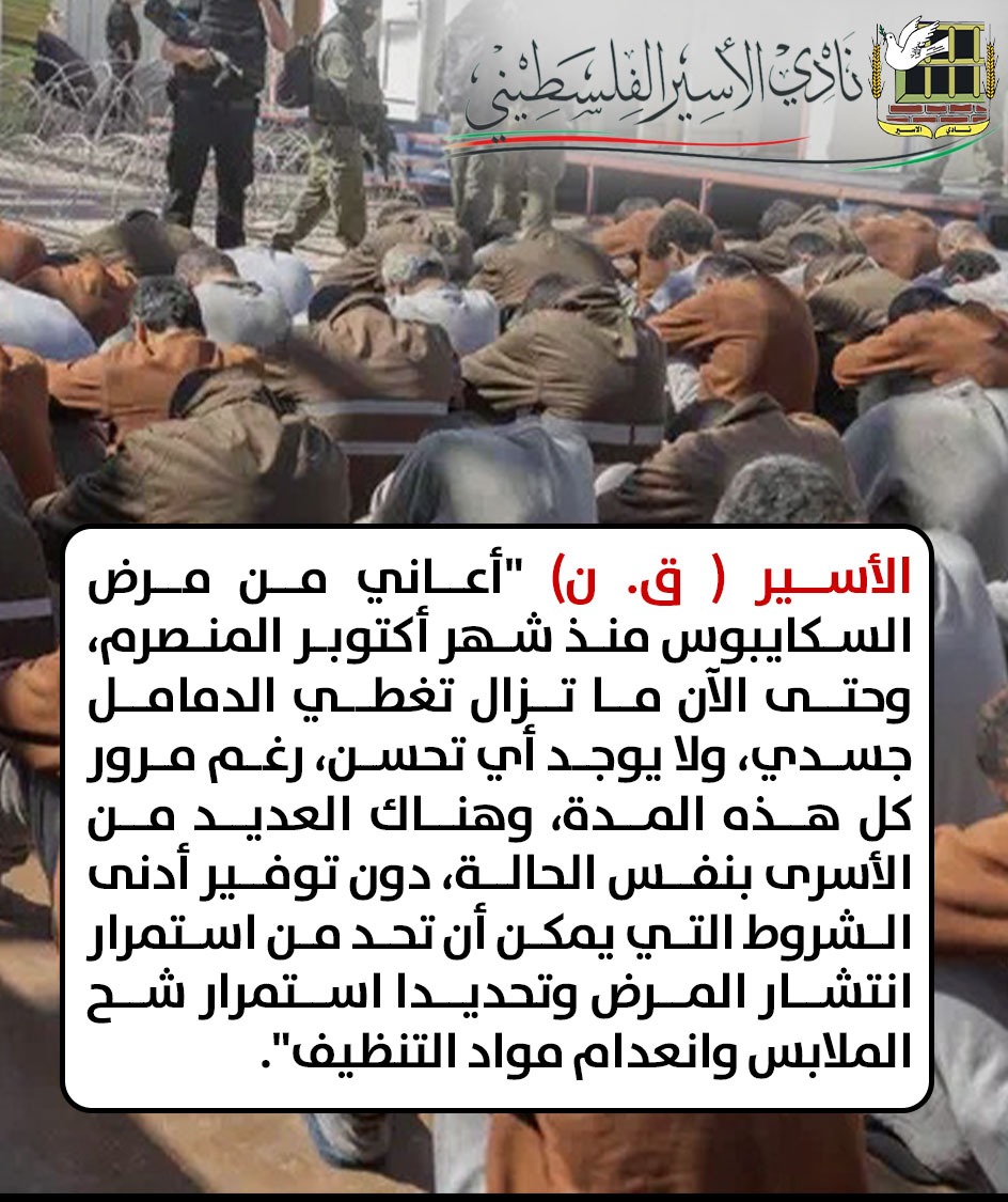 فيما قال الأسير ( ق. ن) "أعاني من مرض السكايبوس من شهر أكتوبر المنصرم، وحتى الآن ما تزال تغطي الدمامل جسدي، ولا يوجد أي تحسن، رغم مرور كل هذه المدة، وهناك العديد من الأسرى بنفس الحالة، فهم من شهور يعانون من الإصابة بمرض الجرب، دون توفير أدنى الشروط التي يمكن أن تحد من استمرار انتشار المرض -وتحديدا- استمرار شح الملابس وانعدام مواد التنظيف"