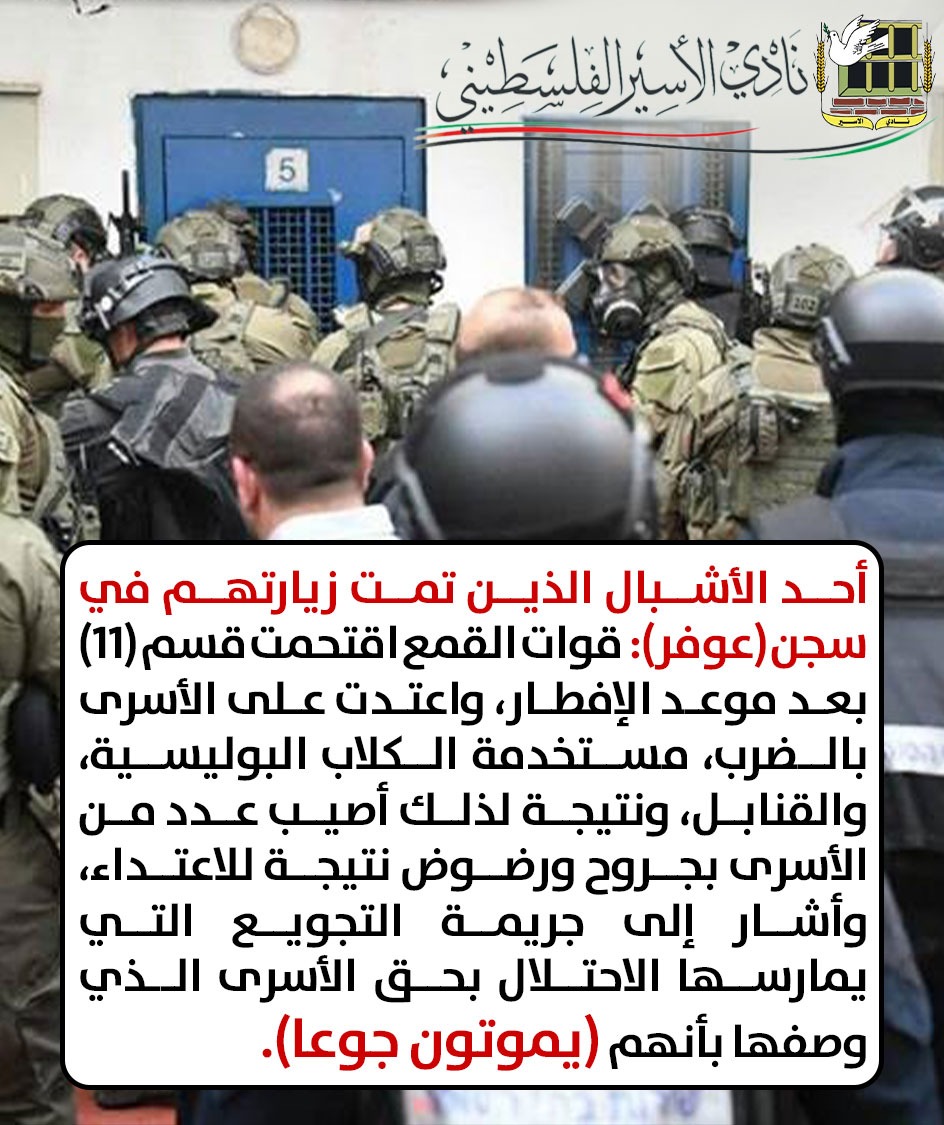 أما في سجن (عوفر)، فما تزال وتيرة عمليات الاقتحامات في تصاعد، ولم تتوقف حتى في شهر رمضان، حيث أشار الأسير (ف. ي): إلى أن قوات القمع اقتحمت قسم (11) بعد موعد الإفطار، واعتدت على الأسرى بالضرب، مستخدمة الكلاب البوليسية، والقنابل، ونتيجة لذلك أصيب عدد من الأسرى بجروح ورضوض نتيجة للاعتداء، وهذا الاعتداء ليس الأول الذي يتعرض له الأسرى في سجن (عوفر) مؤخرا، فهو جزء من سلسلة عمليات اقتحام، وهذا ما أكده أحد الأشبال الذين تمت زيارتهم، فالأوضاع صعبة جدا داخل أقسام الأطفال، جراء استمرار الجرائم الممنهجة بحقهم والتي لا تختلف بمستواها عن الجرائم التي تمارس بحق الأسرى كافة، وبحسب وصف أحد الأسرى الأشبال، بأنهم (يموتون جوعا).