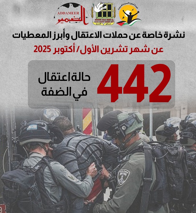 رام الله - قالت مؤسسات الأسرى (هيئة شؤون الأسرى والمحررين ونادي الأسير الفلسطيني، ومؤسسة الضمير لرعاية الأسير وحقوق الإنسان) اليوم الأحد، إنّ قوات الاحتلال الإسرائيلي اعتقلت خلال شهر تشرين الأول/ أكتوبر 2025، (442) مواطناً من محافظات الضفة الغربية بما فيها القدس، من بينهم ثلاث نساء و(33) طفلاً. وقد تركزت عمليات الاعتقال في محافظة بيت لحم، ورافقها تنفيذ تحقيقات ميدانية واسعة في مناطق عدة من الضفة، إلى جانب اعتداءات المستوطنين التي ساهمت في تصاعد وتيرة الاعتقالات في عدد من البلدات.