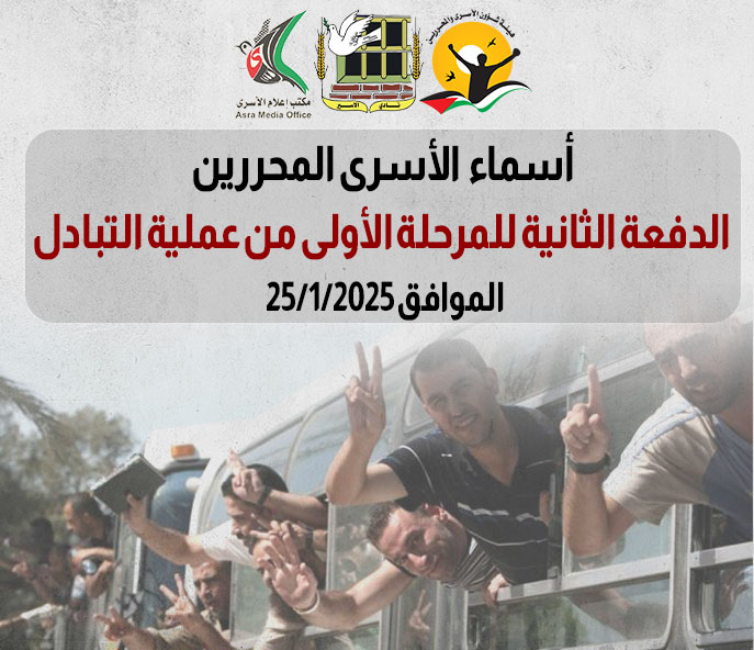 ■ هيئة شؤون الأسرى والمحررين ونادي الأسير الفلسطيني ومكتب إعلام الأسرى، يعلنون أسماء الأسرى المحررين ضمن الدفعة الثانية من صفقة التبادل في المرحلة الأولى