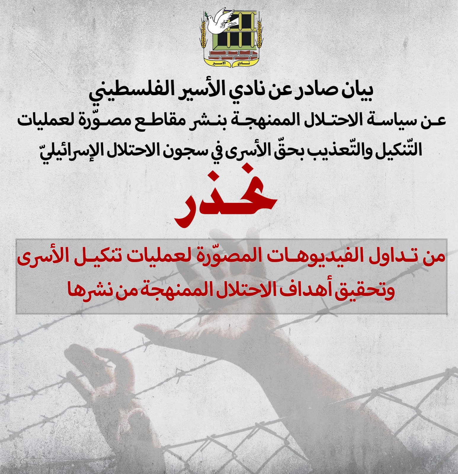 🔴 بيان صادر عن نادي الأسير الفلسطيني عن سياسة الاحتلال الممنهجة بنشر مقاطع مصوّرة لعمليات التّنكيل والتّعذيب بحقّ الأسرى في سجون الاحتلال الإسرائيليّ