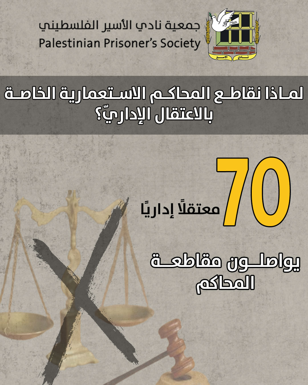 في ضوء استمرار 70 معتقلًا إداريًا مقاطعتهم لمحاكم الاحتلال نرفق رسالة وجهها المعتقلون الإداريون عن أهمية وضرورة مقاطعة المحاكم العسكرية