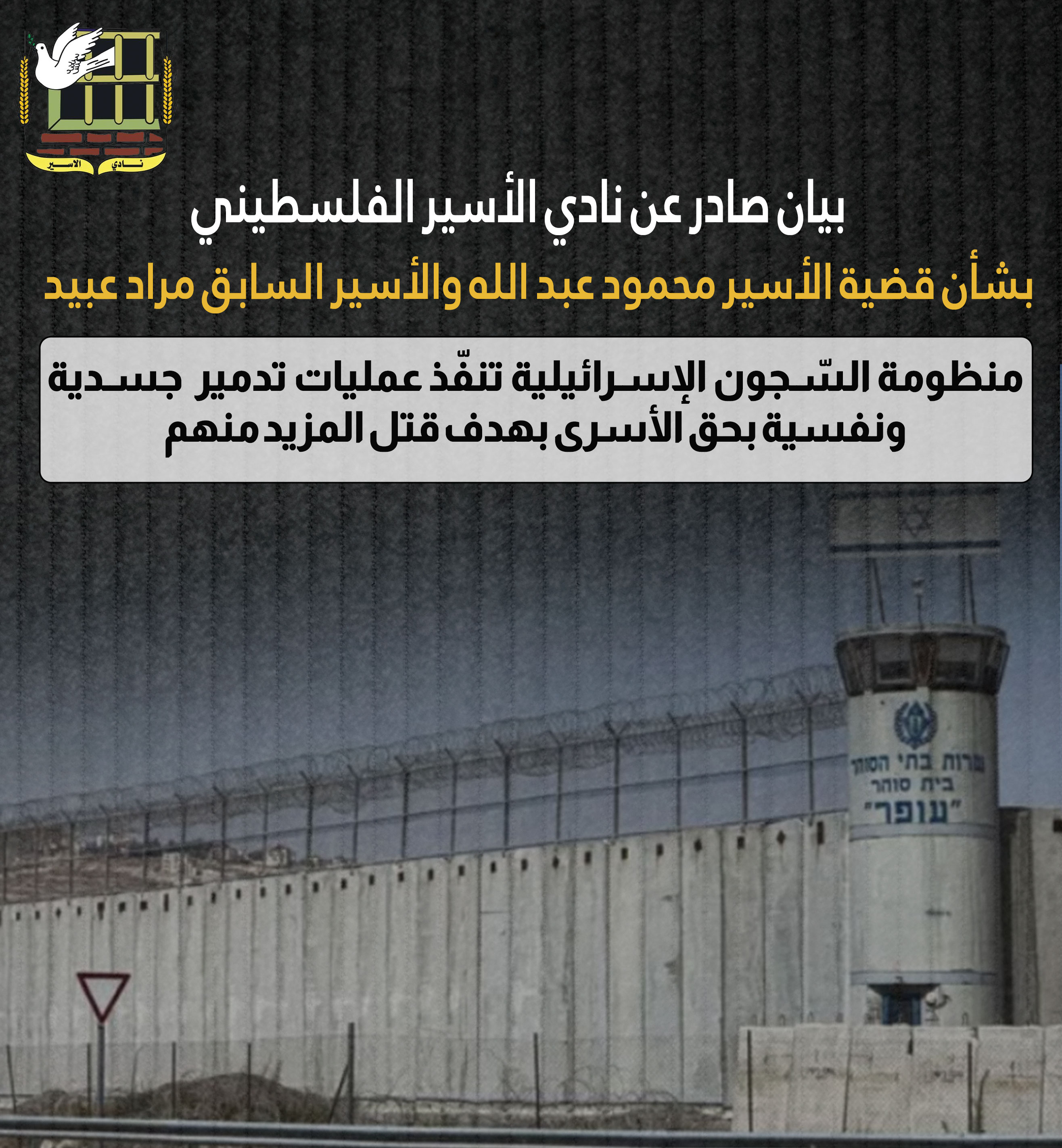 ⭕ بيان صادر عن نادي الأسير الفلسطيني بشأن قضية الأسير محمود عبد الله والأسير السابق مراد عبيد