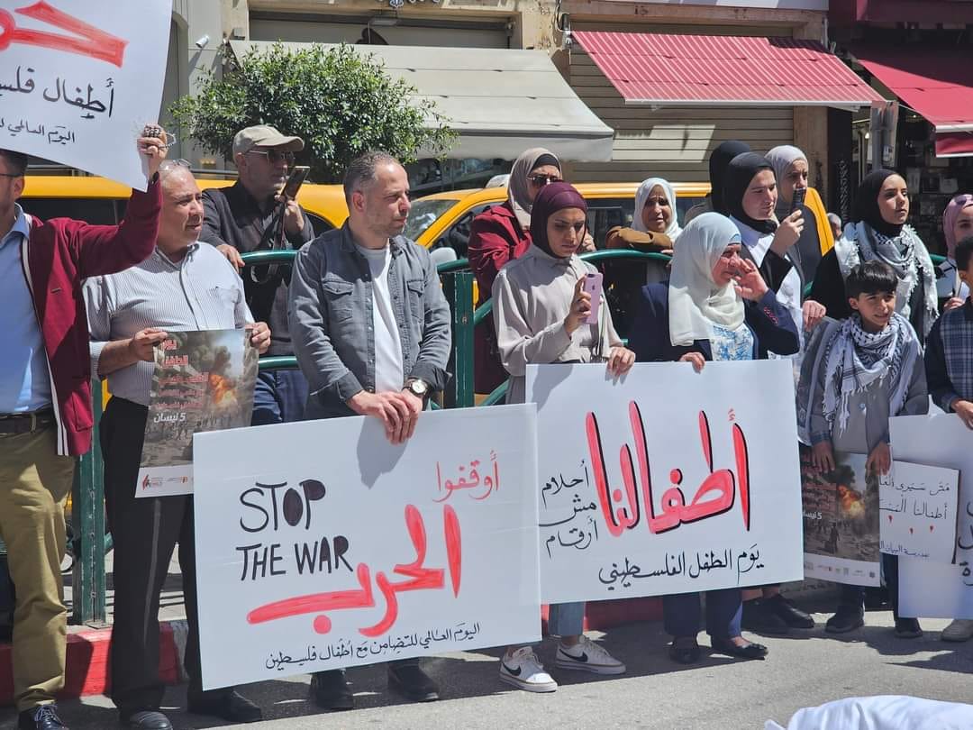 نظمت وقفة على دوار ابن رشد وسط الخليل، بمشاركة المؤسسات الحقوقية ونادي الأسير الفلسطيني ، والإغاثة الطبية، ومديرية التربية والتعليم، رفع خلالها المشاركون مجسمات لأطفال شهداء، ولافتات تطالب بحماية حقوق الأطفال، ووقف معاناة أطفال غزة، واخرى تدعو لوقف العدوان.والافراج الفوري عن الاسرى الأطفال