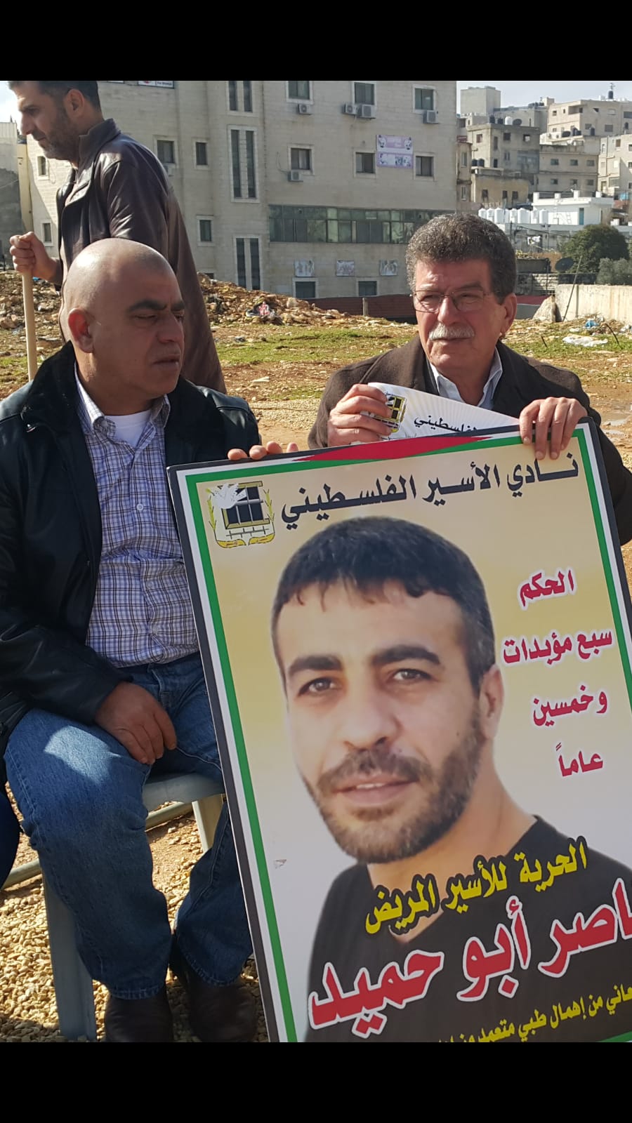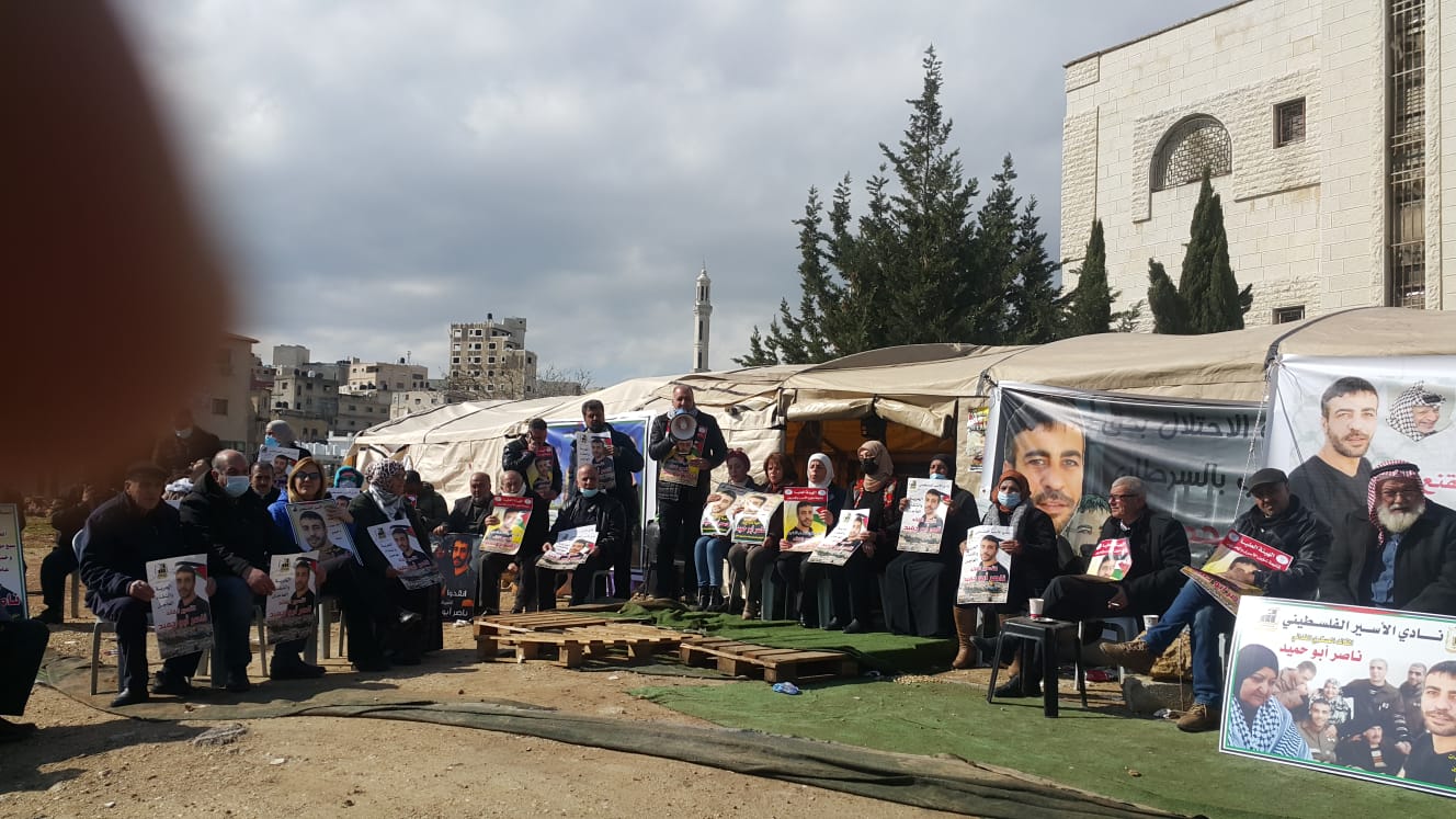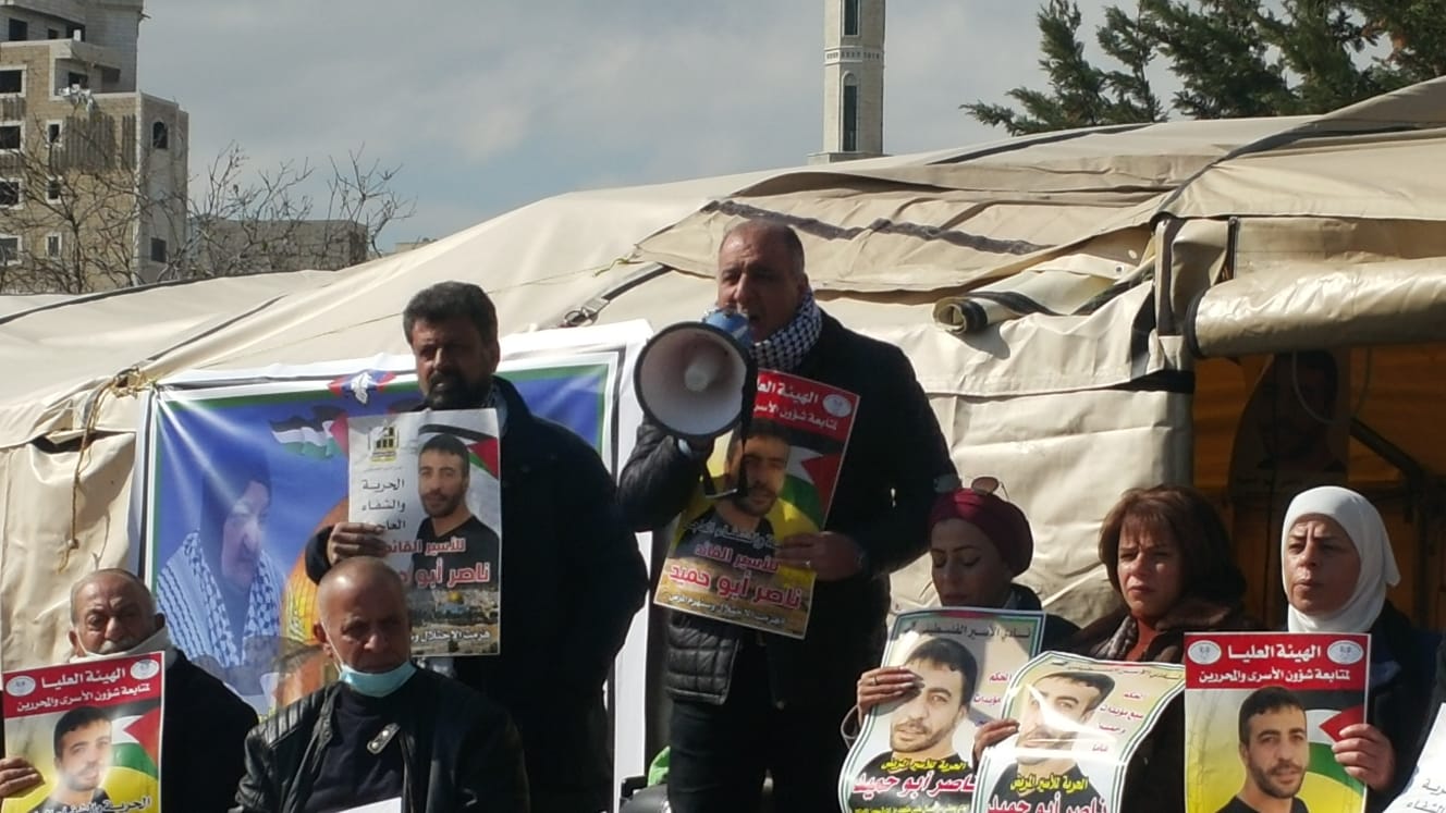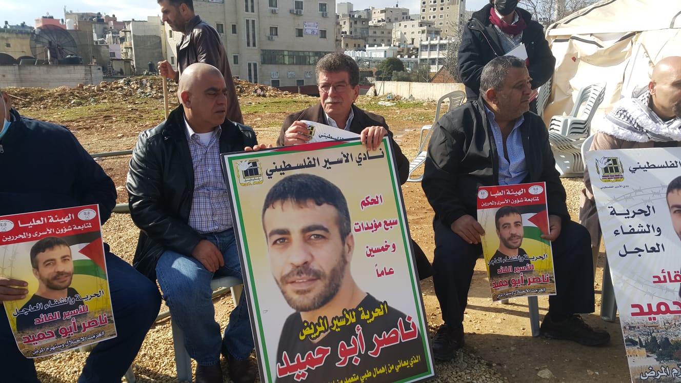صور | من فعاليات الوقفة التضامنية لدعم ومساندة الأسير ناصر أبو حميد أمام خيمة الاعتصام في مخيم الأمعري رام الله.