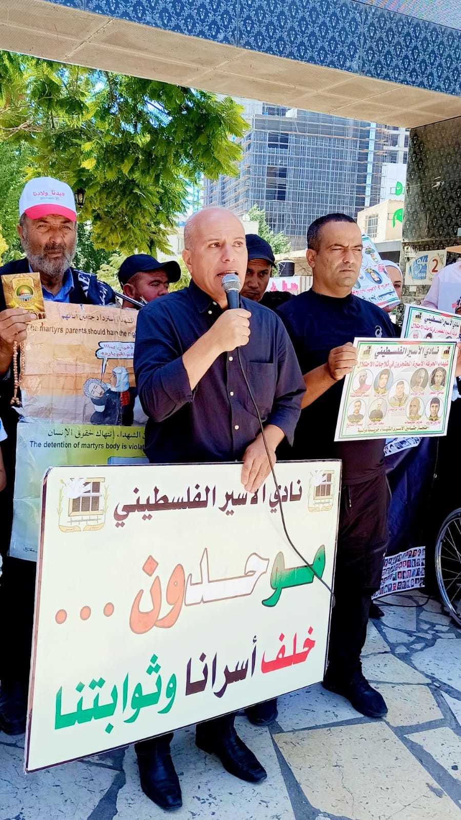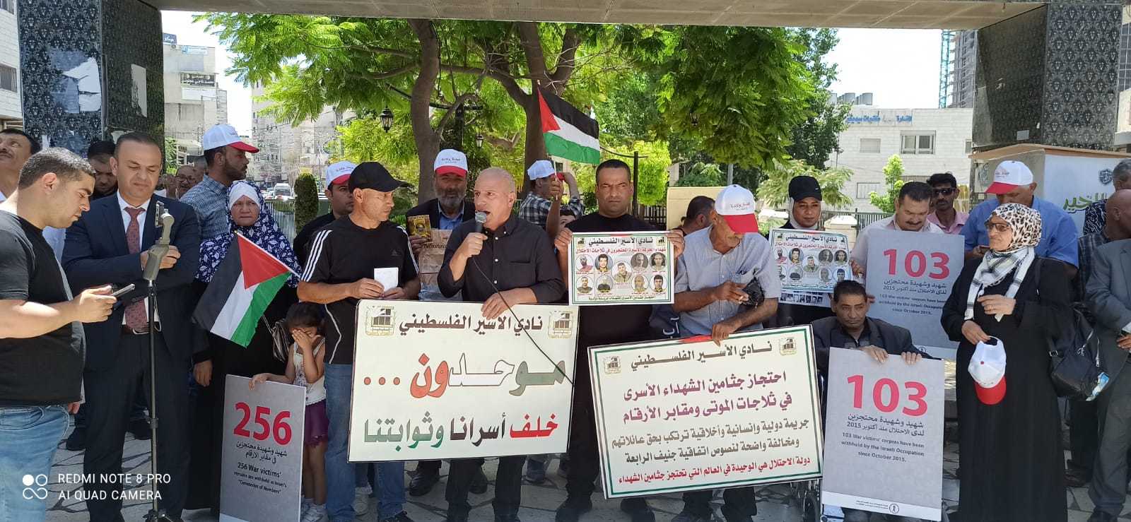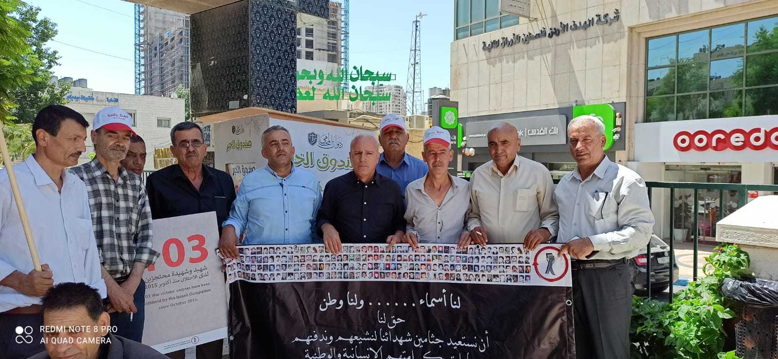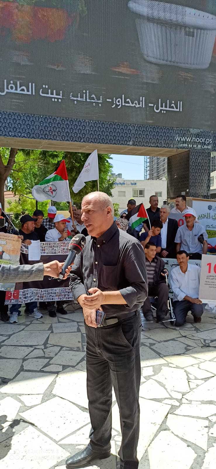 جانب من الوقفة اليوم السبت على دوار ابن رشد في الخليل دعما وإسنادا للأسرى في خطواتهم وللمطالبة باسترداد جثامين الشهداء في اليوم الوطني الخاص بهم