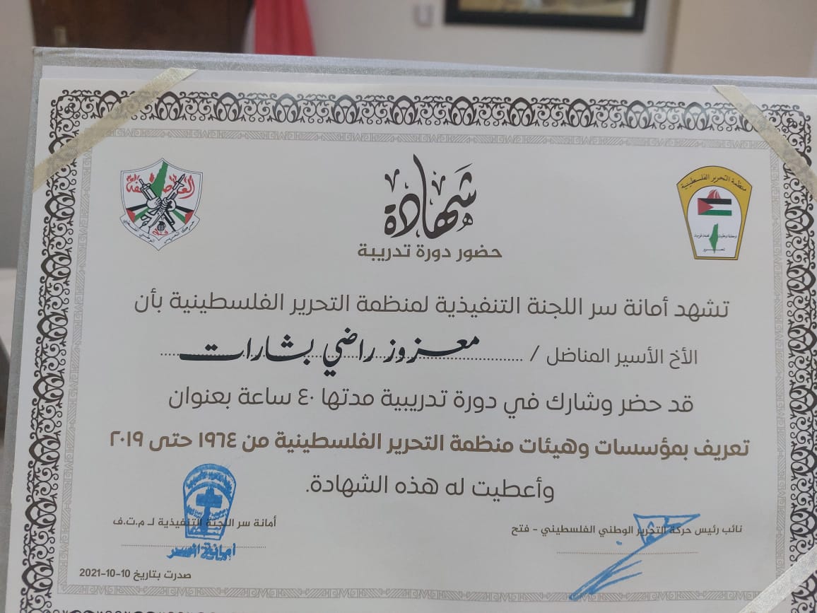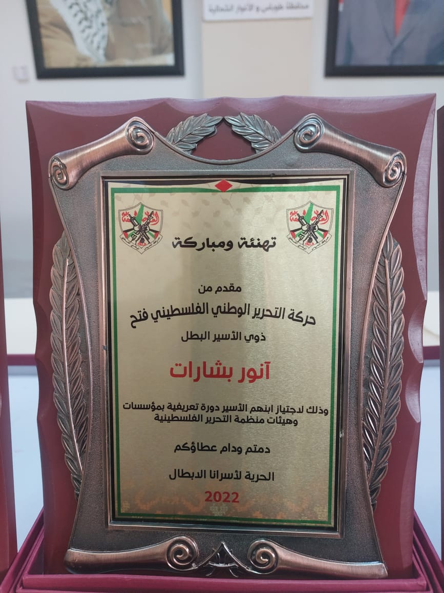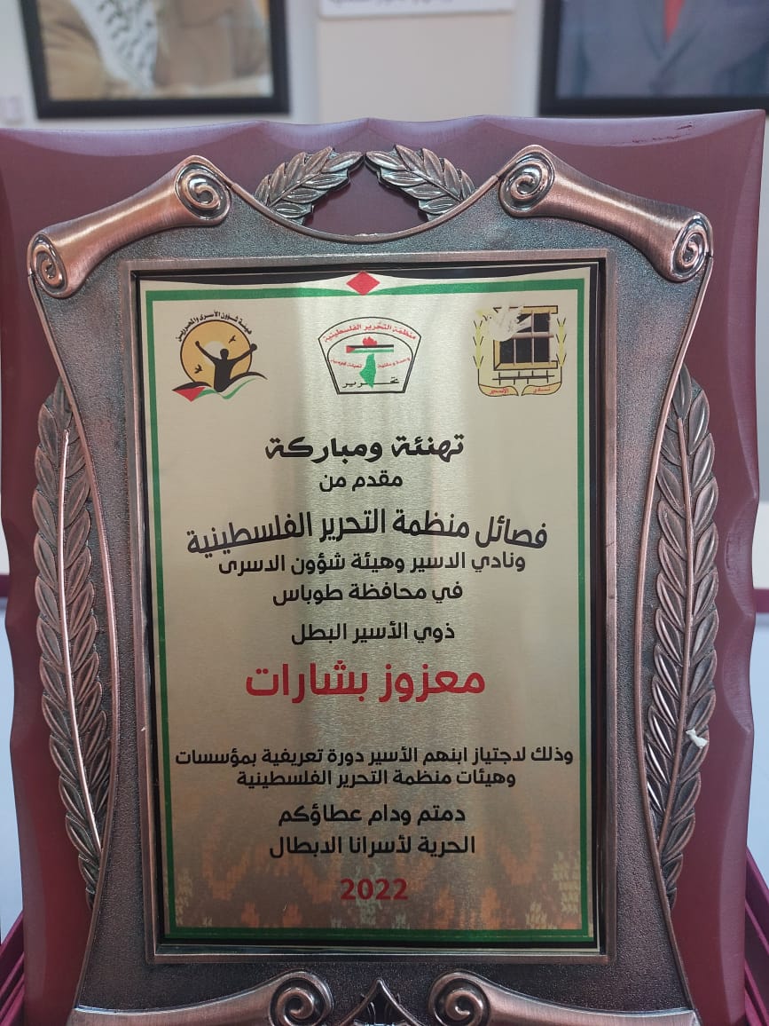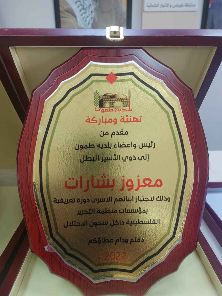 تكريم ذوي الاسيرين أنور ومعزوز بشارات من قبل محافظه طوباس ونادي الأسير الفلسطيني وهيئه شؤون الأسرى والمحررين ولجنه التنسيق الفصائلي لأجتيازهم دوره تعريفيه بمؤسسات وهيئات منظمه التحرير الفلسطينيه بواقع ٤٠ ساعه في سجن ريمون