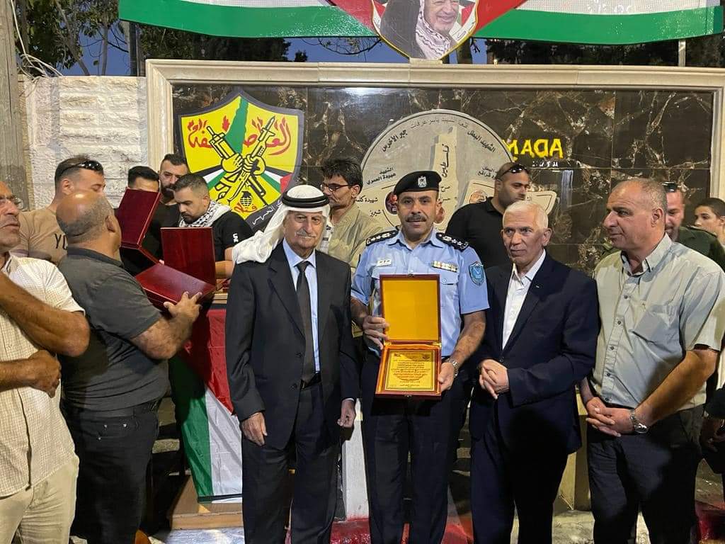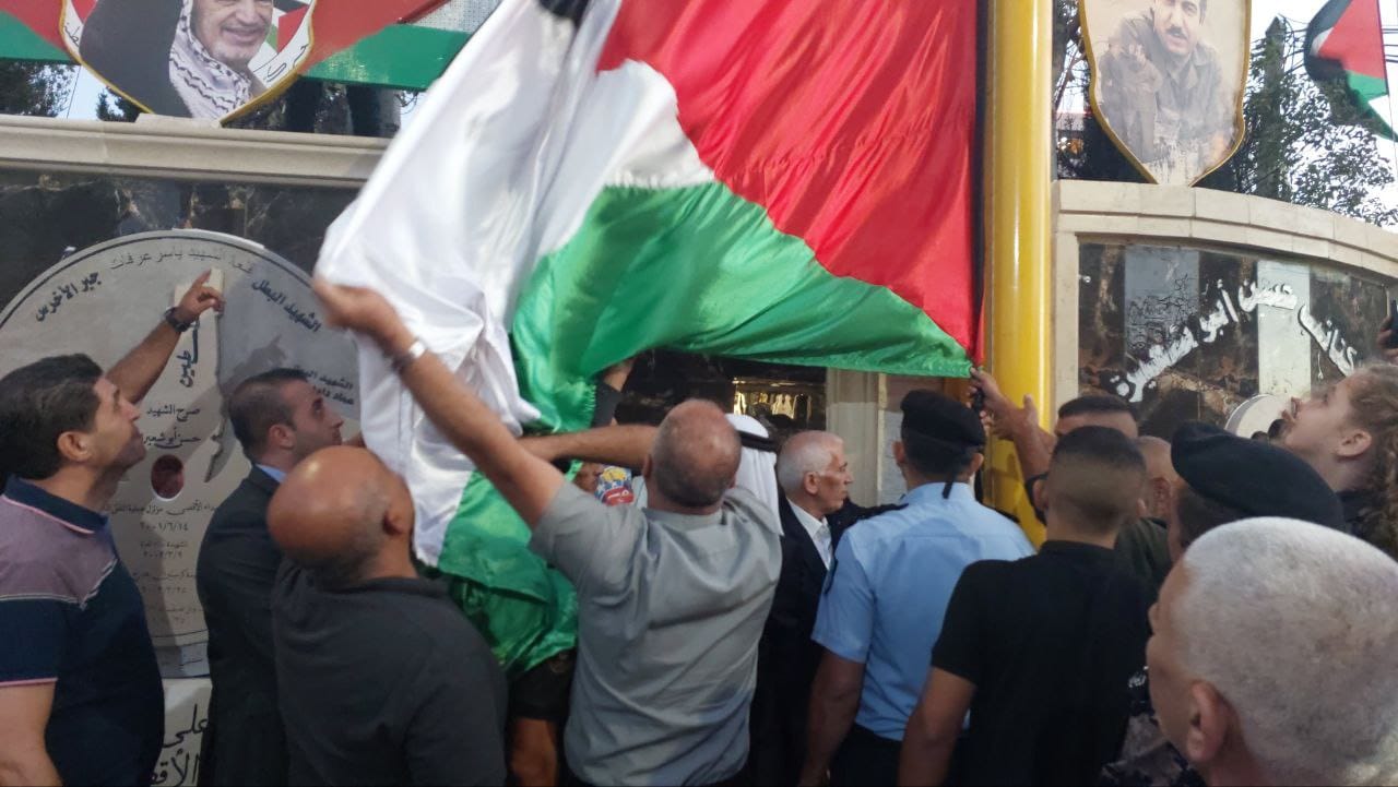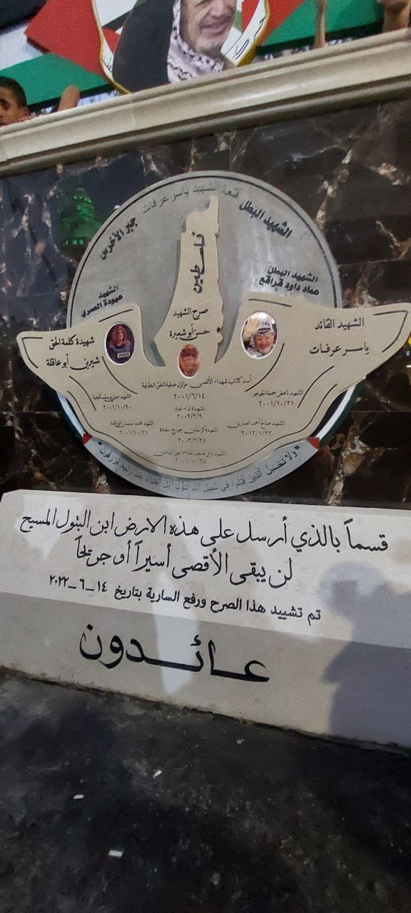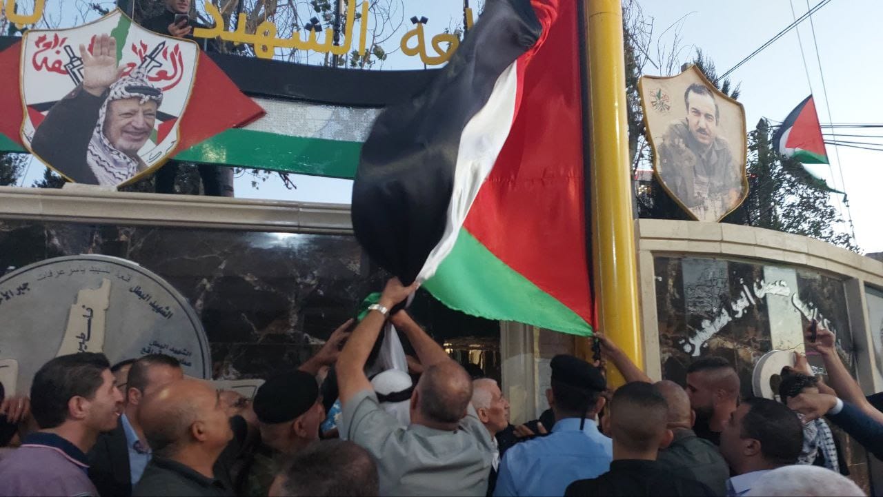 جانب من مشاركة نادي الاسير الفلسطيني في رفع اطول سارية علم في محافظة بيت لحم وافتتاح صرح الشهداء في مخيم بيت جبرين العزة حيث تحدث الاخ عبد الله الزغاري نيابة عن عائلة الأسير القائد ناصر أبو حميد علما بأن خنساء فلسطين ام ناصر أبو حميد ساهمت بتقديم العلم الفلسطيني لرفعه على السارية